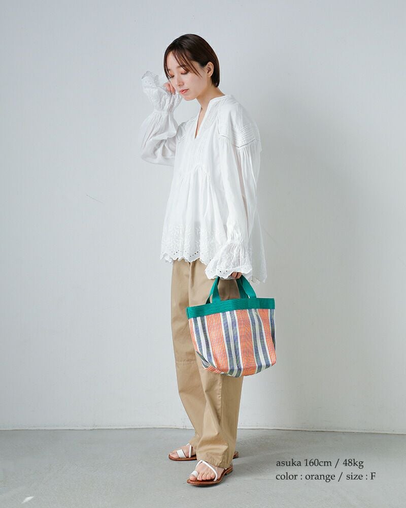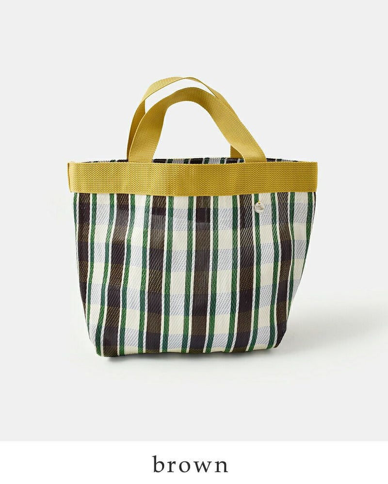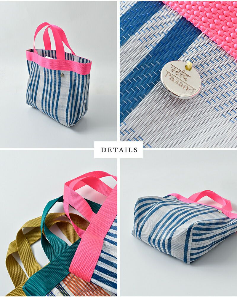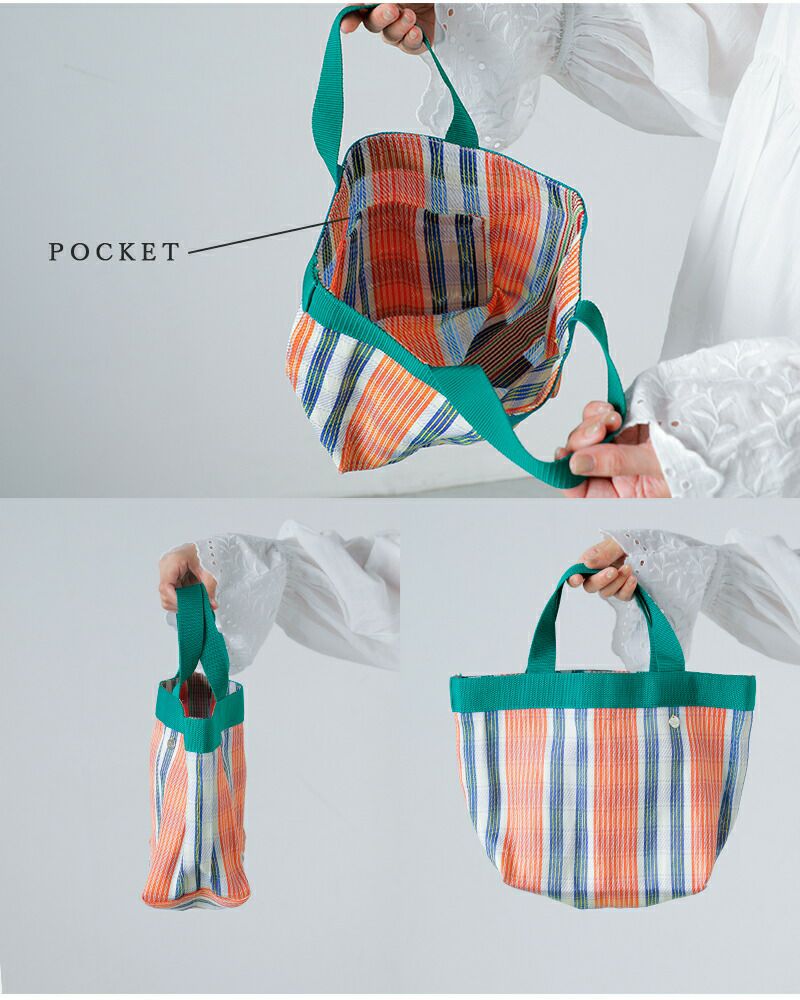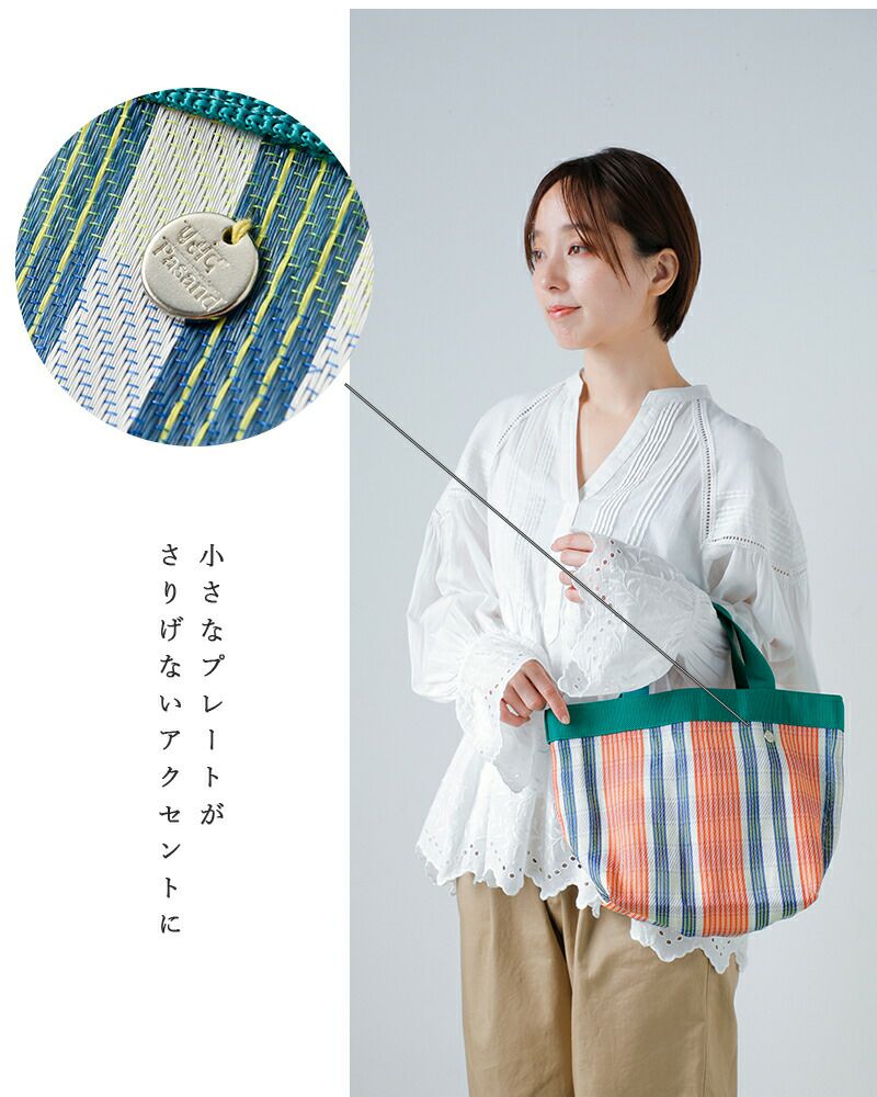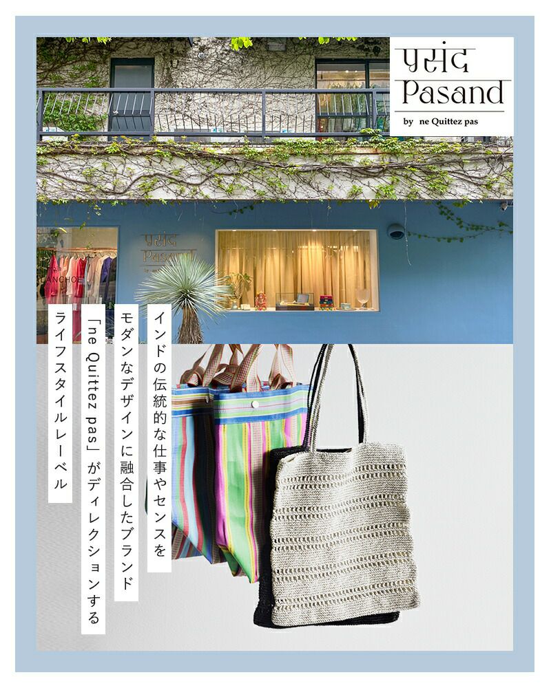 Pasand by ne Quittez pas(パサンド バイ ヌキテパ)より、マルチストライプ メッシュ スモール バッグ “Multi Stripe Mesh Small Bag” のご紹介です。 通気性に優れたメッシュ素材を使用した、春夏らしい軽やかな佇まいのトートバッグ。さらりとした使い心地で、シーズンムードを爽やかに演出してくれます。 コンパクトなサイズ感ながら、マチ付きのデザインで見た目以上の収納力を備えており、厚みのある荷物もすっきりと収まります。 目を惹くマルチストライプが、シンプルなスタイリングにほどよい彩りを添える、アクセントとしても活躍するアイテムです。