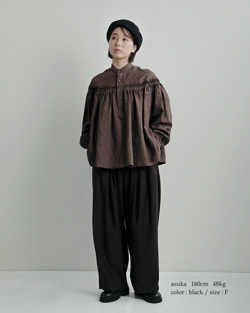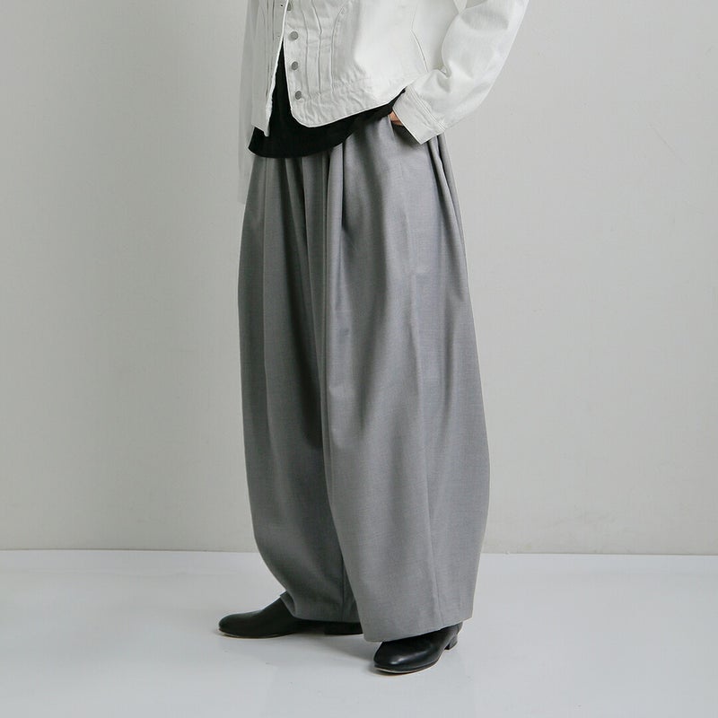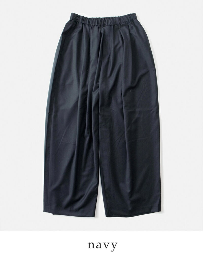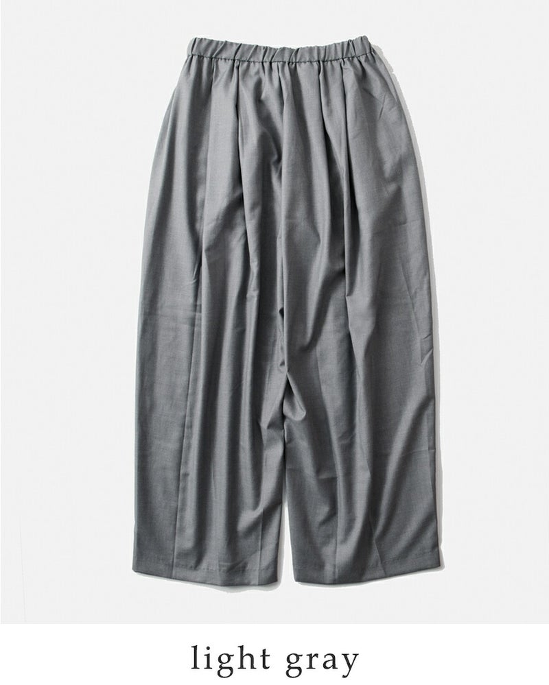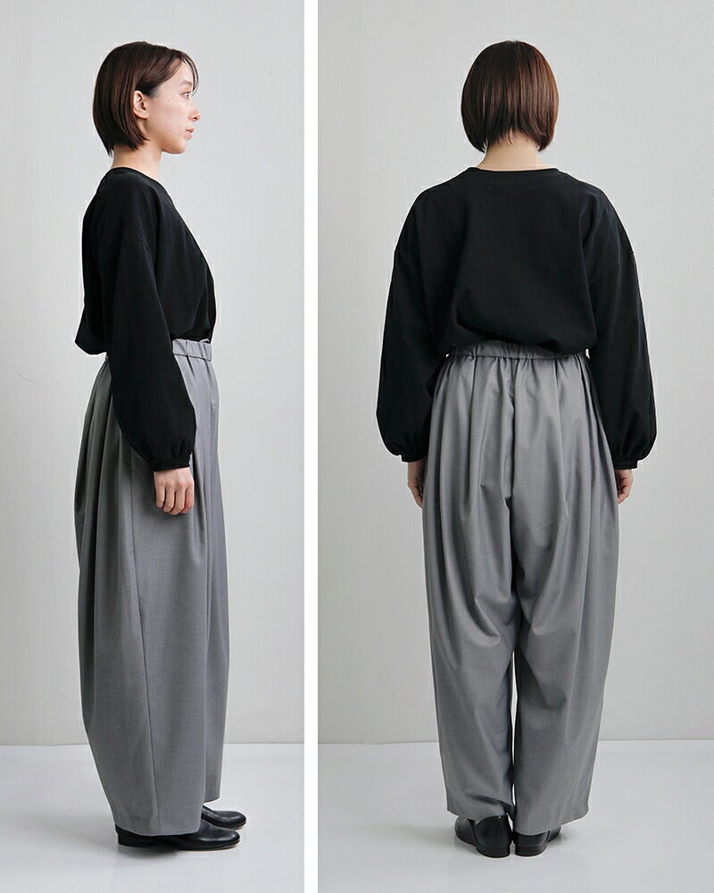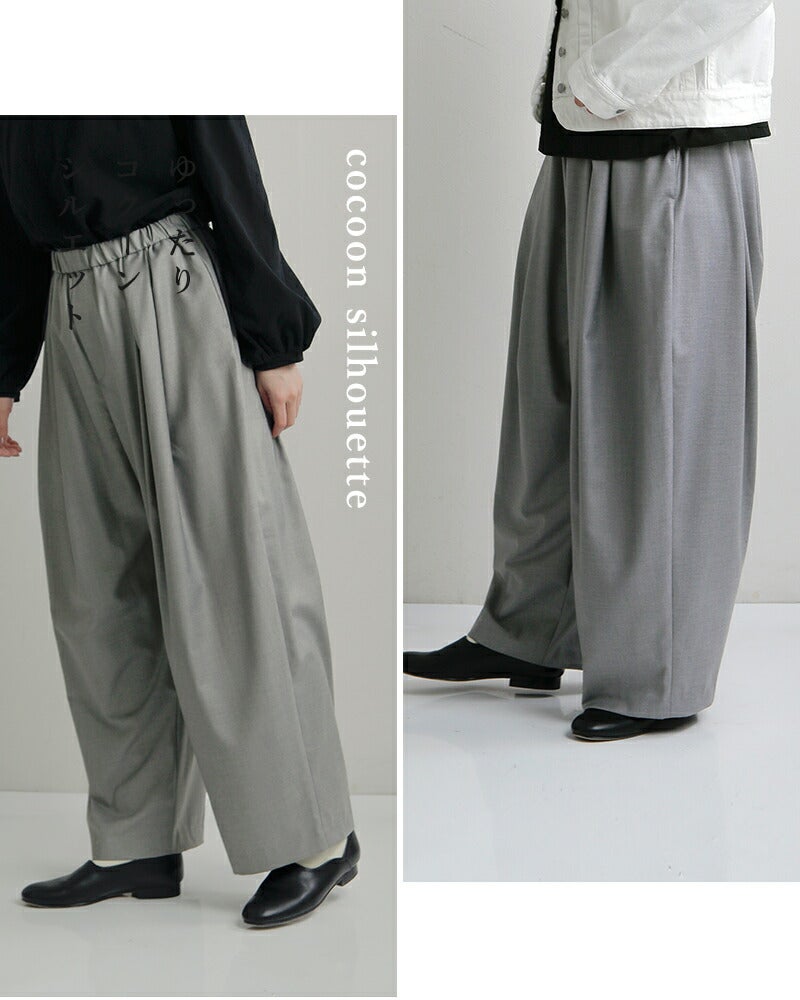 ゆったりとしたコクーンシルエットで、メンズライクなスラックスを女性らしい印象に仕上げています。裾にいくほど細くなるテーパードの形で、身長が低い方でも靴のところにたまる感じで着用いただけます。