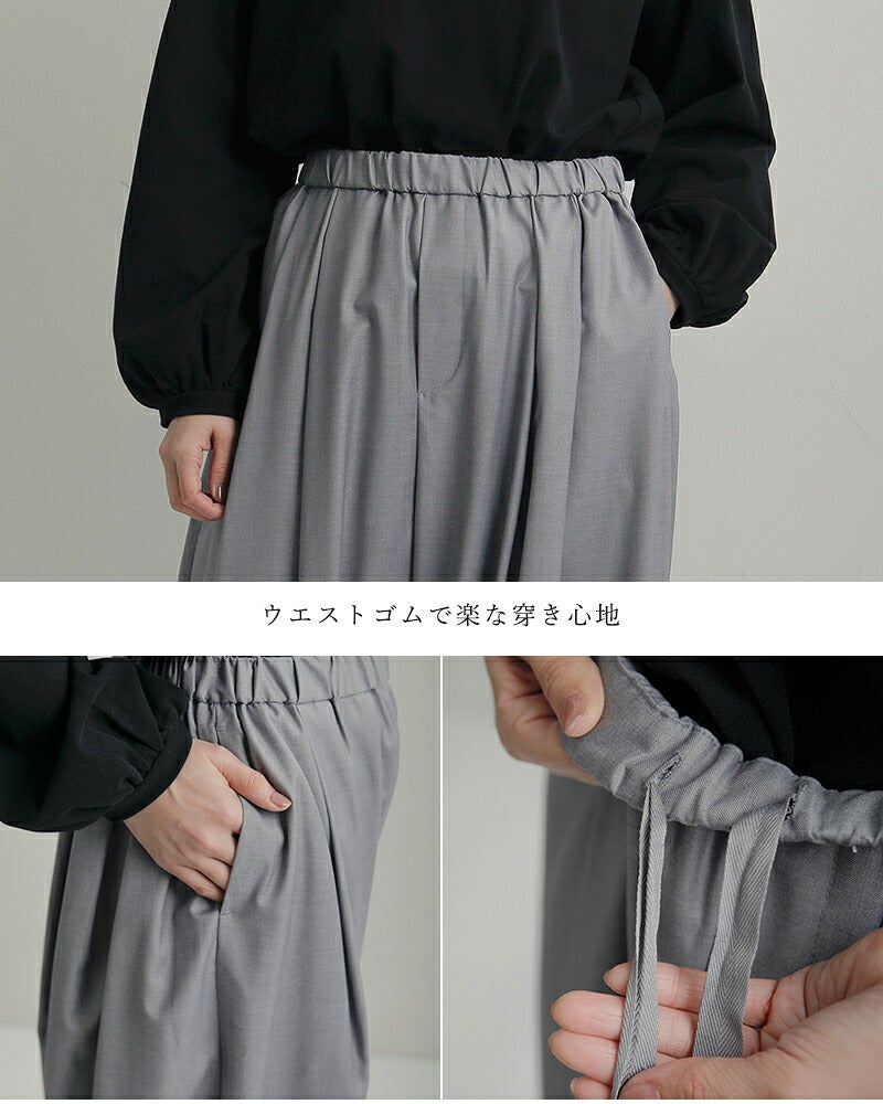 ウエストゴムで、楽な穿き心地。ウエスト周りにたっぷりとタックを施し、気になる部分の体型カバーもしっかりしてくれます。