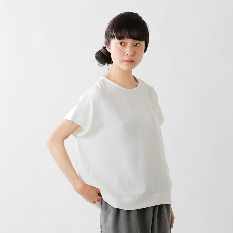 身幅にゆとりがあり楽に過ごせるプルオーバー。肩周りをすっきりと見せるフレンチスリーブに生地のドレープも相まって、品の良い見え方でご着用いただけます。普段使いはもちろんのこと、ジャケットやアクセサリーと合わせてオケージョン使いにもおすすめ◎。