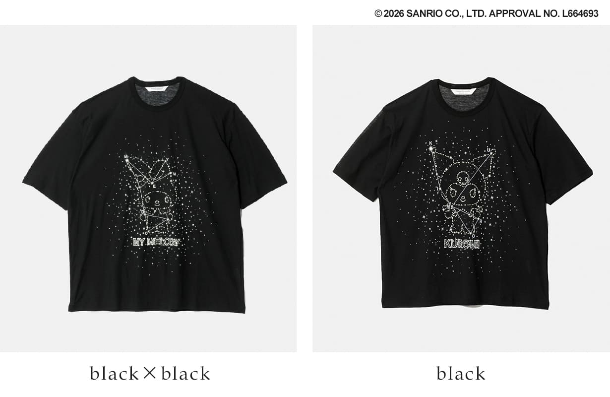 beautiful people(ビューティフルピープル)より、ハイゲージ天竺 ボックス クルーネック Tシャツ MY MELODY&KUROMI をご紹介します。ボックスシルエットのクルーネックTシャツ。前身頃に星座をモチーフにしたマイメロディとクロミの蓄光プリントを配置。後身頃にも星座をモチーフにしたブランドロゴの蓄光プリントが施されています。暗闇で星座のようにグラフィックが浮かび上がります。※black→KUROMI、black× black→MY MELODY