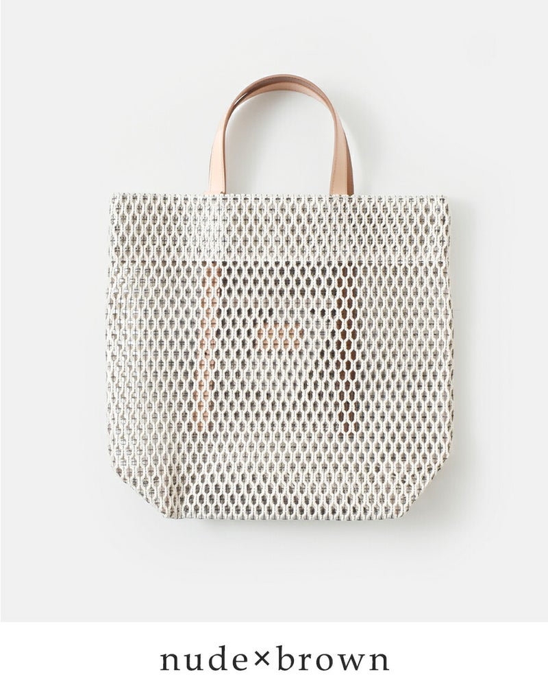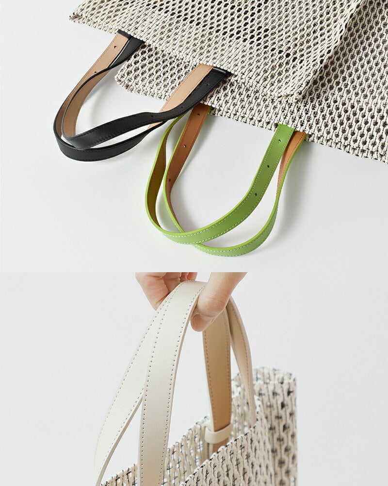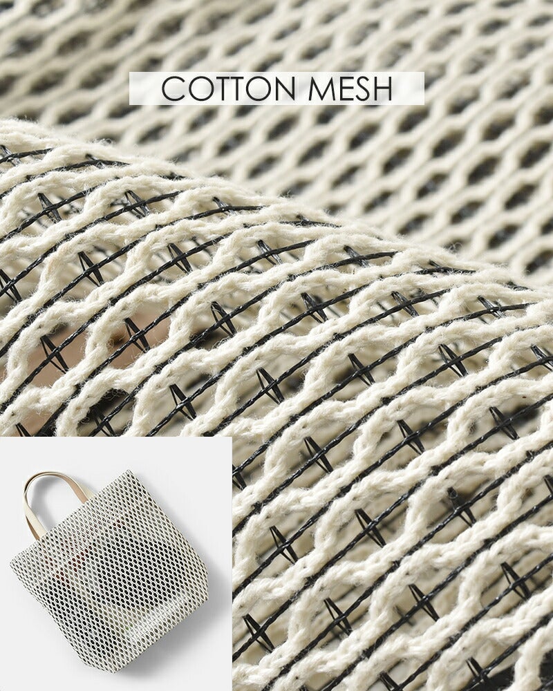 コットン糸とポリエステル糸を合わせて編み込んだメッシュ素材。コットンのナチュラルで柔らかな風合いに、ポリエステル糸で補強をプラスしてハリのある質感に仕上がっています。ほんのり透け感がありながらも荷物が透けすぎず、安心してお使いいただけます。