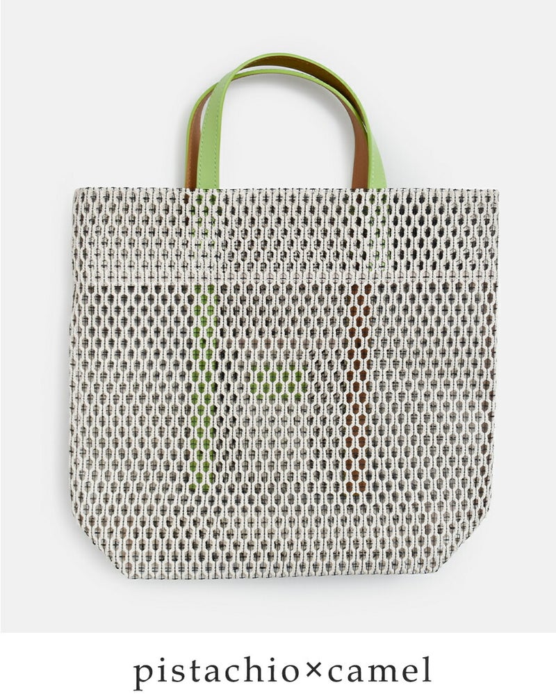 コットン糸とポリエステル糸を合わせて編み込んだメッシュ素材。コットンのナチュラルで柔らかな風合いに、ポリエステル糸で補強をプラスしてハリのある質感に仕上がっています。ほんのり透け感がありながらも荷物が透けすぎず、安心してお使いいただけます。