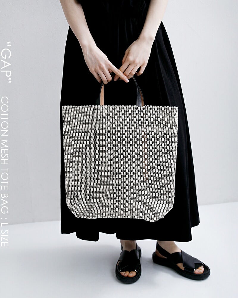 MARY AL TERNA(メアリオルターナ)より、コットンメッシュトートバッグ L GAPのご紹介です。たっぷりと収納できる大型サイズの使いやすいトートバッグです。通気性に優れたメッシュ生地を使用しており、程よいハリ感がカジュアル過ぎず上品な印象を演出。カジュアルにもきれいめにも合わせやすいデザインと素材感のアイテムです。