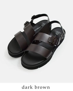 ダークトーンの上質な本革を使用し、落ち着きのあるシックな印象に仕上げたデザインです。ソールはブラックで統一することで全体に一体感が生まれ、より洗練された佇まいに。ワイドなストラップが足元に程よい存在感を添え、モード感のある大人のスタイルを演出します。