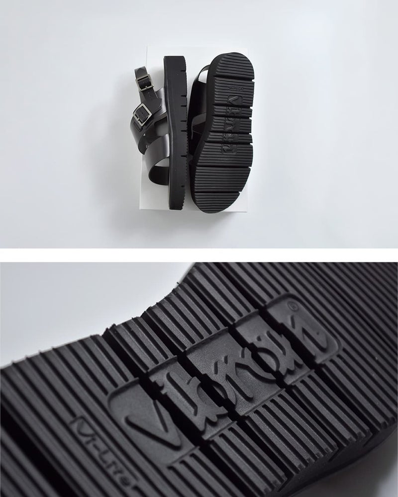 サイドにバックルを配したアシンメトリーデザインとなり、サイドからは少しハードな印象のルックスとなっています。ぼってりと分厚いソールは、地面をしっかりと捉えて安定した歩行を提供します。