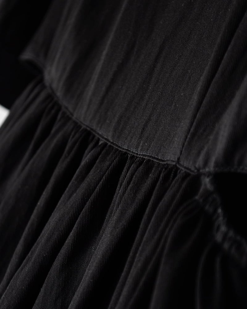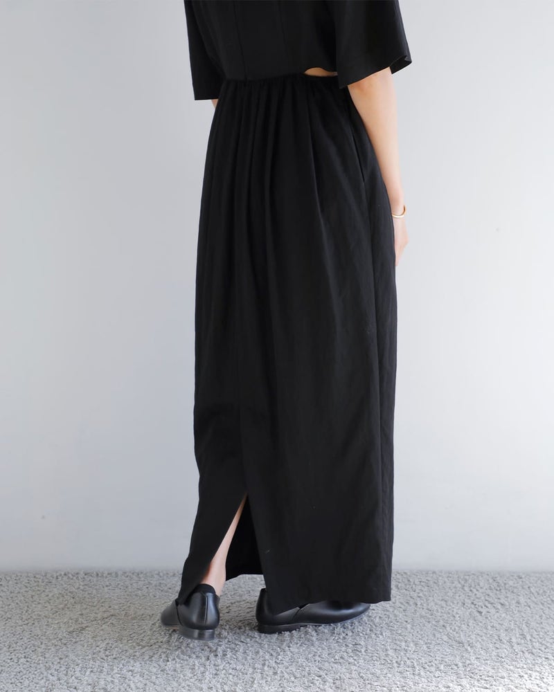広がりすぎないスカートラインと、ウエストギャザーによる自然な立体感で構成された、落ち着きのある大人らしいコクーンシルエットです。