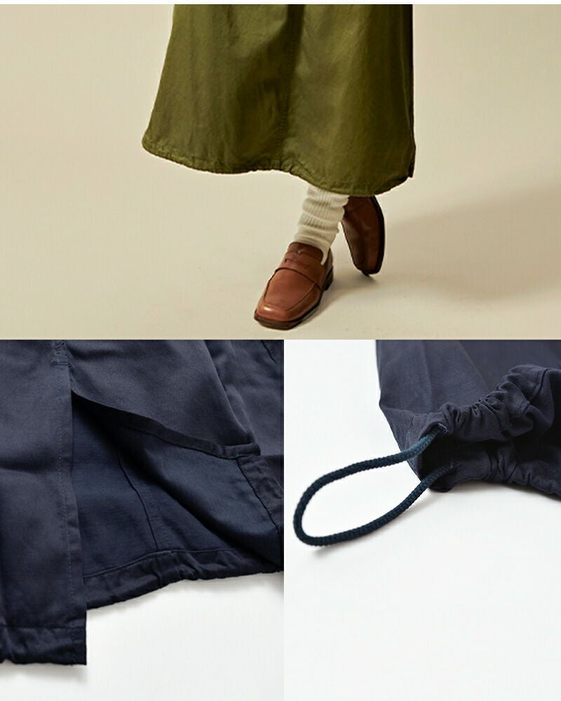裾に大きめのスリットを入れて抜け感を演出し、非常に軽やかな足捌きを楽しむことができます。裾のコードでシルエットのアレンジを楽しめるようデザインされている点も魅力的♪