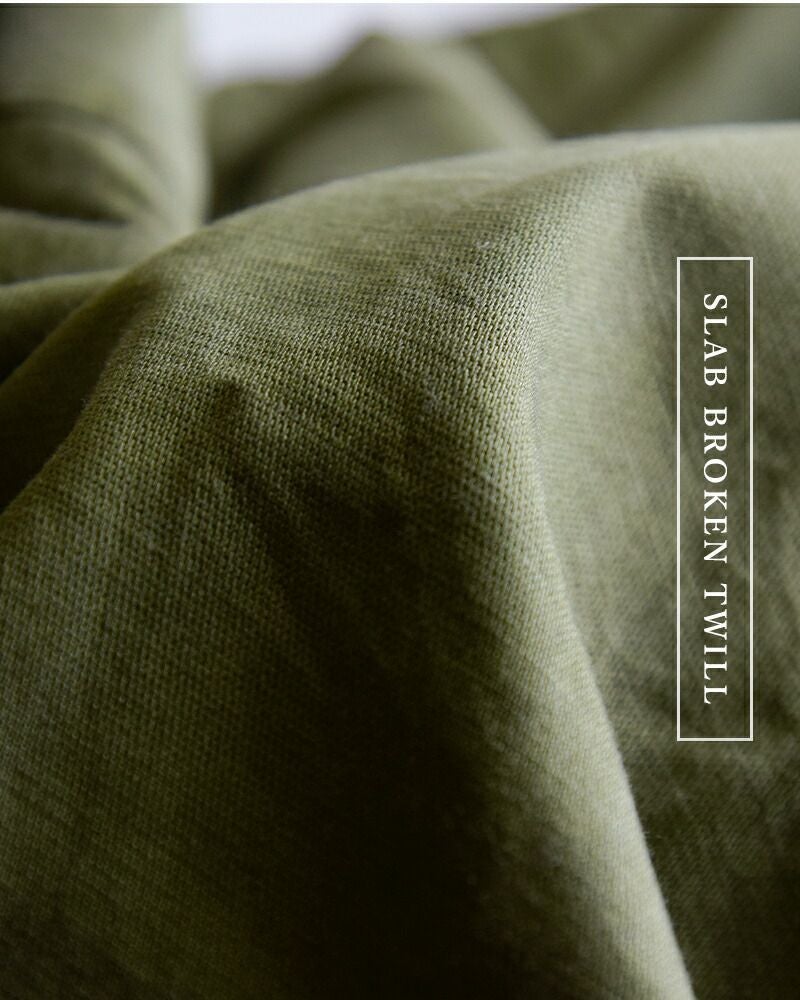 リヨセル/コットンの見た目と反して柔らかな落ち感が特徴的なスラブブロークンツイルを使用し、製品洗いで雰囲気良く仕上げました。