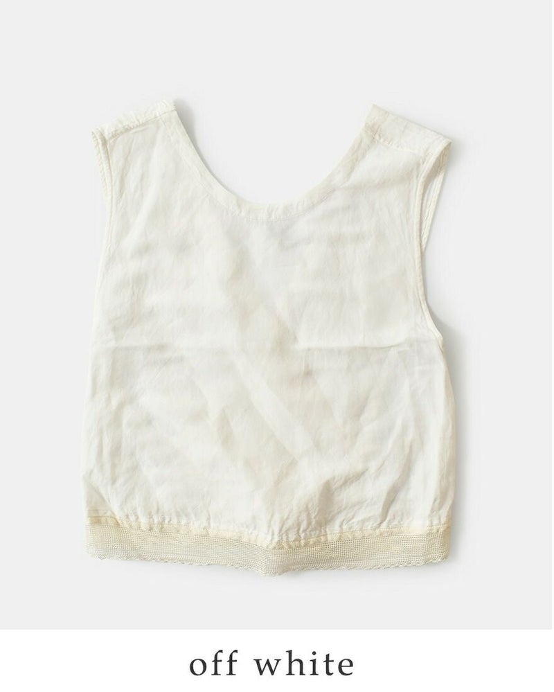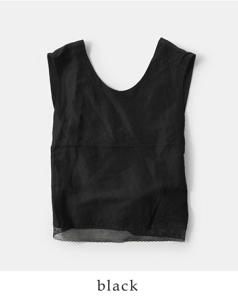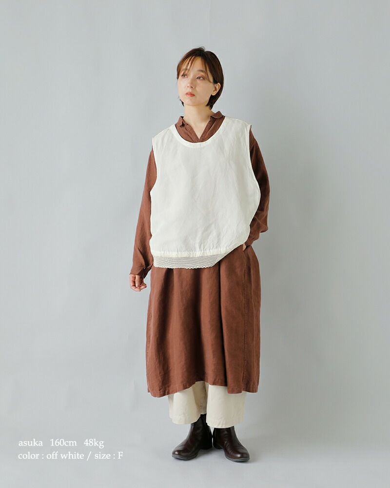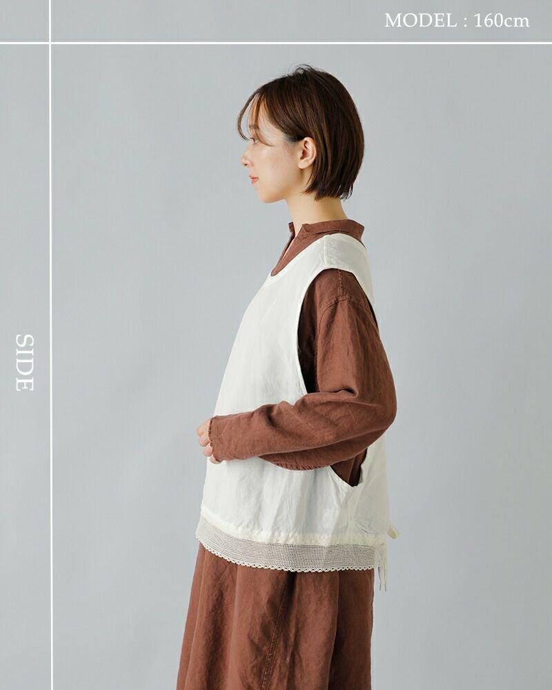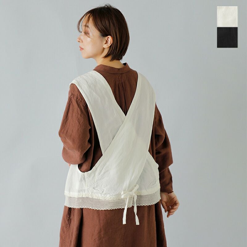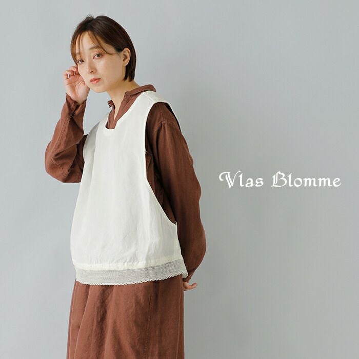 Vlas Blomme(ヴラスブラム・ブラスブラム)よりリネン バンブー スワロー ジレのご紹介です。バックでクロスする印象的なシルエットと、裾にあしらわれたレースディテールが、シンプルな装いに華を添える一枚。タテ糸に再生繊維のバンブーレーヨン、ヨコ糸にリネンを交織した平織生地を使用。バンブーレーヨンの持つ落ち感や抗菌性・吸放湿性に、リネンのナチュラルな風合いを掛け合わせることで、程よいハリと柔らかな光沢感を兼ね備えた特別な素材感に仕上がりました。ナチュラルでありながらドラマチックな存在感は、ワンピースやブラウスに重ねるだけで、特別なスタイルを演出してくれます。