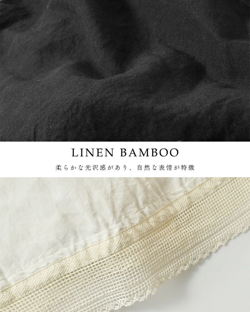 タテ糸に再生繊維のバンブーレーヨン、ヨコ糸にリネンを使用した交織平織生地。竹を原料としたバンブーレーヨンには天然素材の優れた抗菌力、吸放湿性があります。バンブーレーヨンの落ち感にリネンをかけ合わせることで程よいハリ感が出て、それぞれの素材の良さを活かした生地に仕上がりました。世界的にも希少なシャトル織機で、ゆっくりと丁寧に織り上げた高密度生地。柔らかな光沢感があり、自然な表情が特徴。