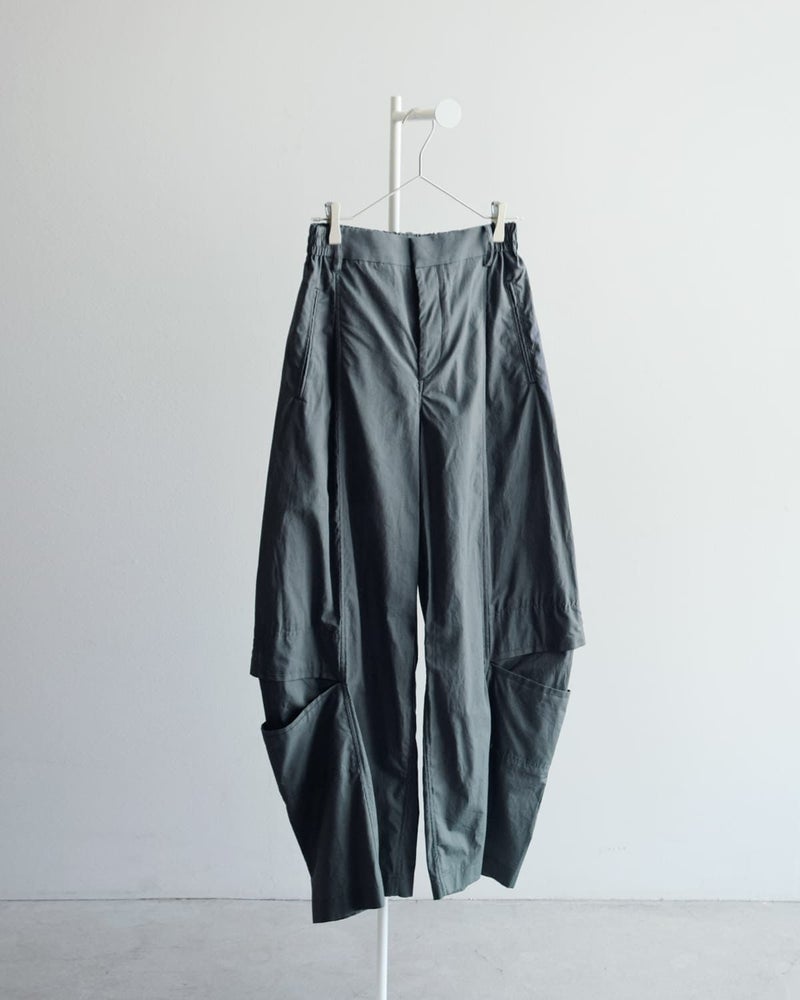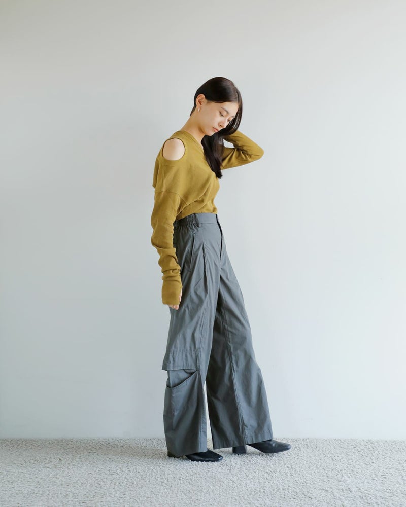 ゆったりとした分量感のイージーワイドパンツ。ハーフパンツの構造線にスリットを入れ脇線を下に落とした独特なO脚シルエットが特徴です。フロント切り替えにクリースラインのプレスを施すことで、カジュアル過ぎないデザインに仕上げています。後ろウエストゴム仕様でイージーに着脱可能。モードな雰囲気でハイセンスなパンツスタイルをお楽しみいただけます。