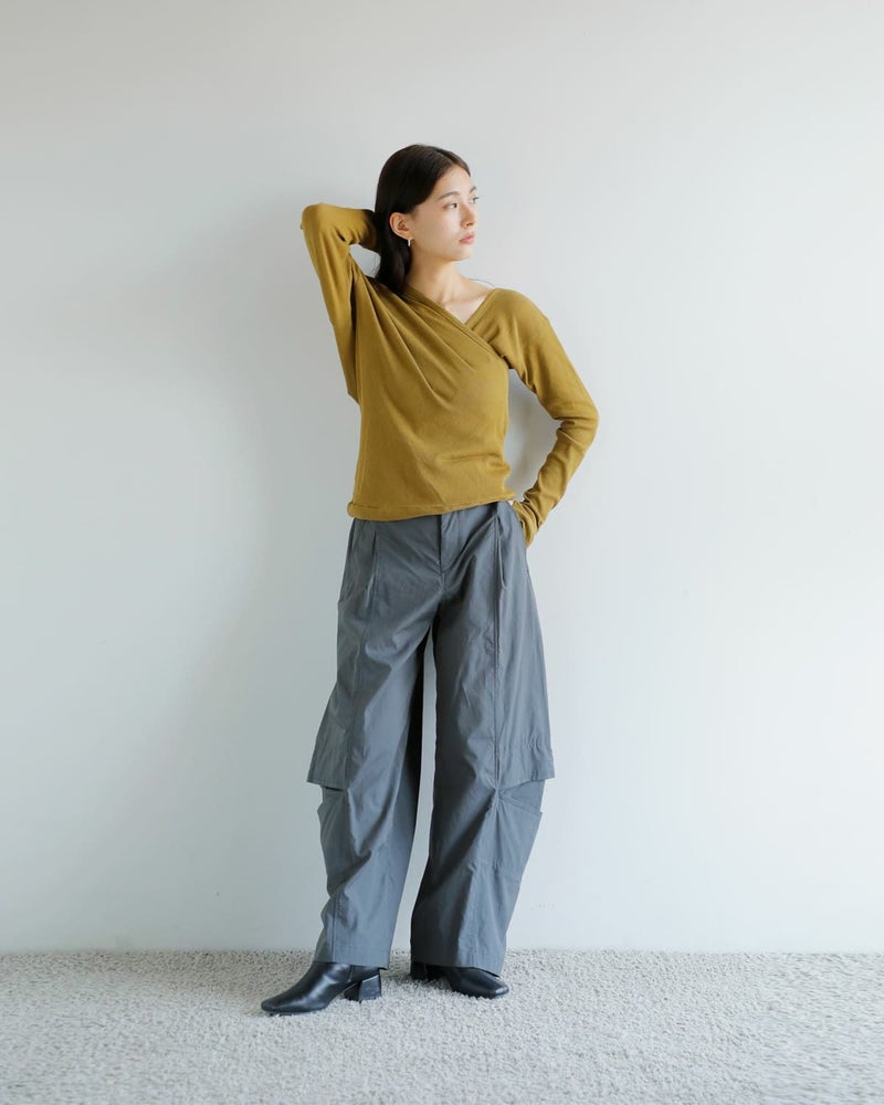 膝下にスリットが入った辛口モードなデザインのパンツ。膝下からテーパードがかかることで、シャープさがでて、全体がすっきりと見えます。