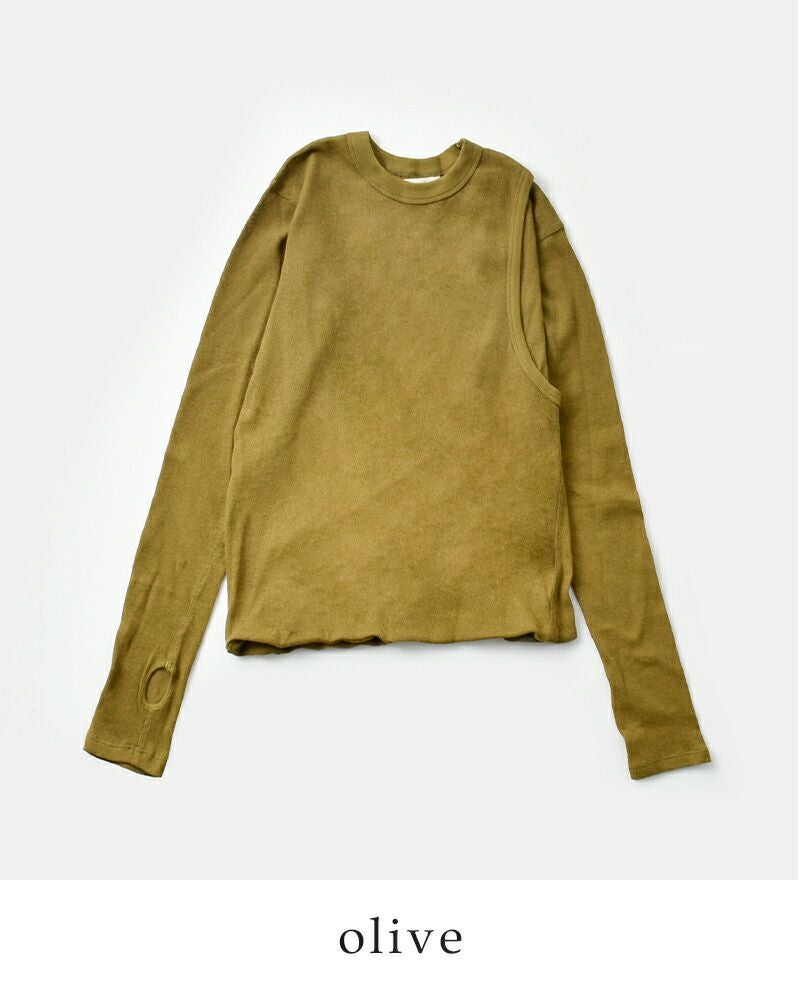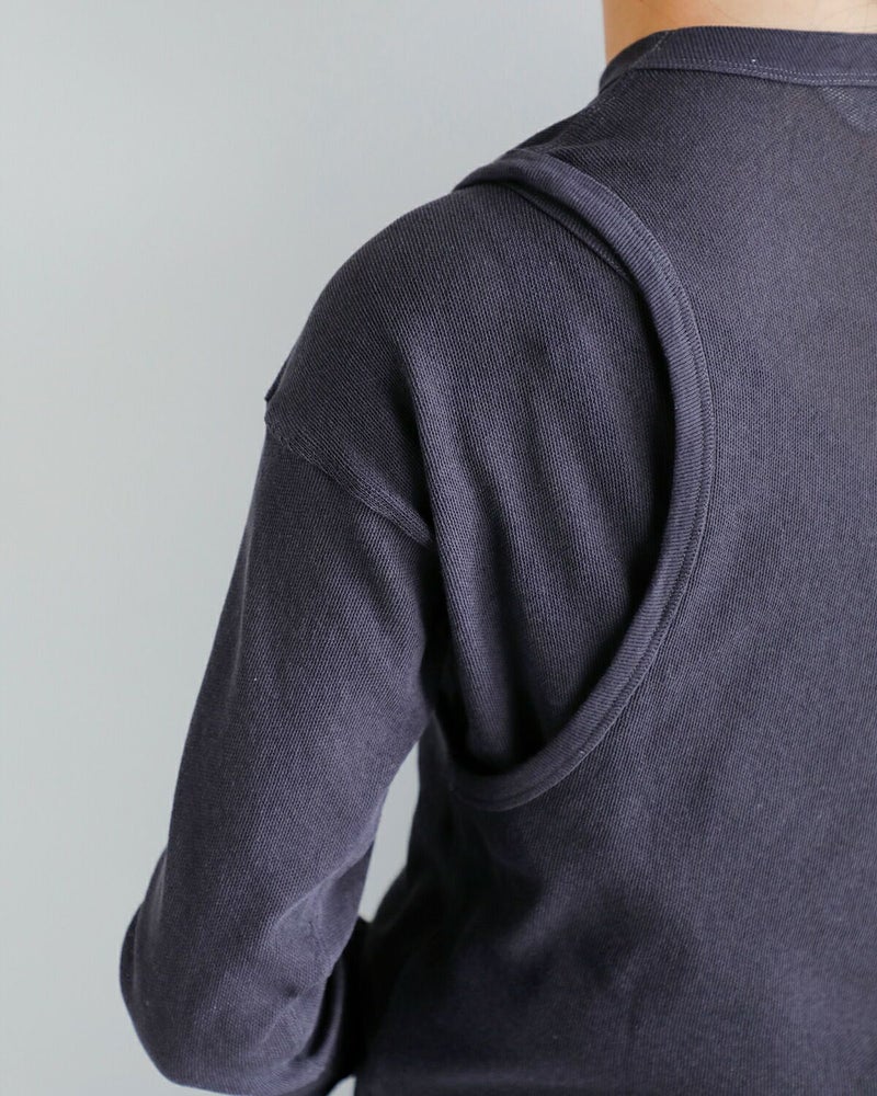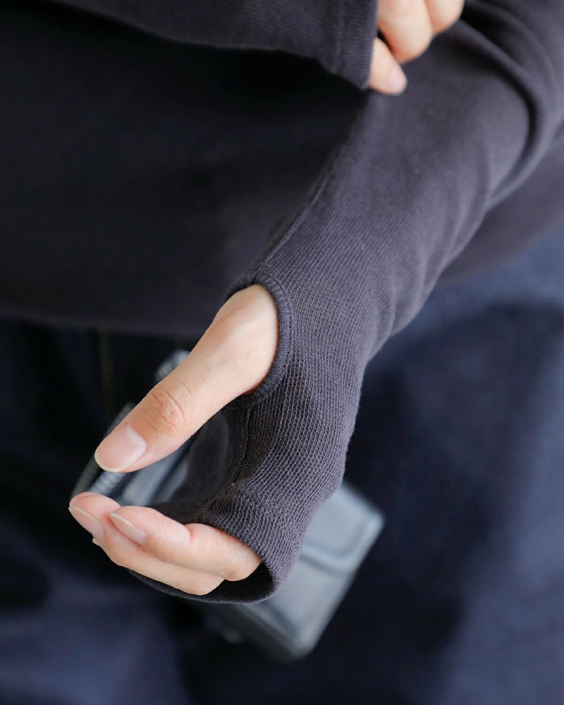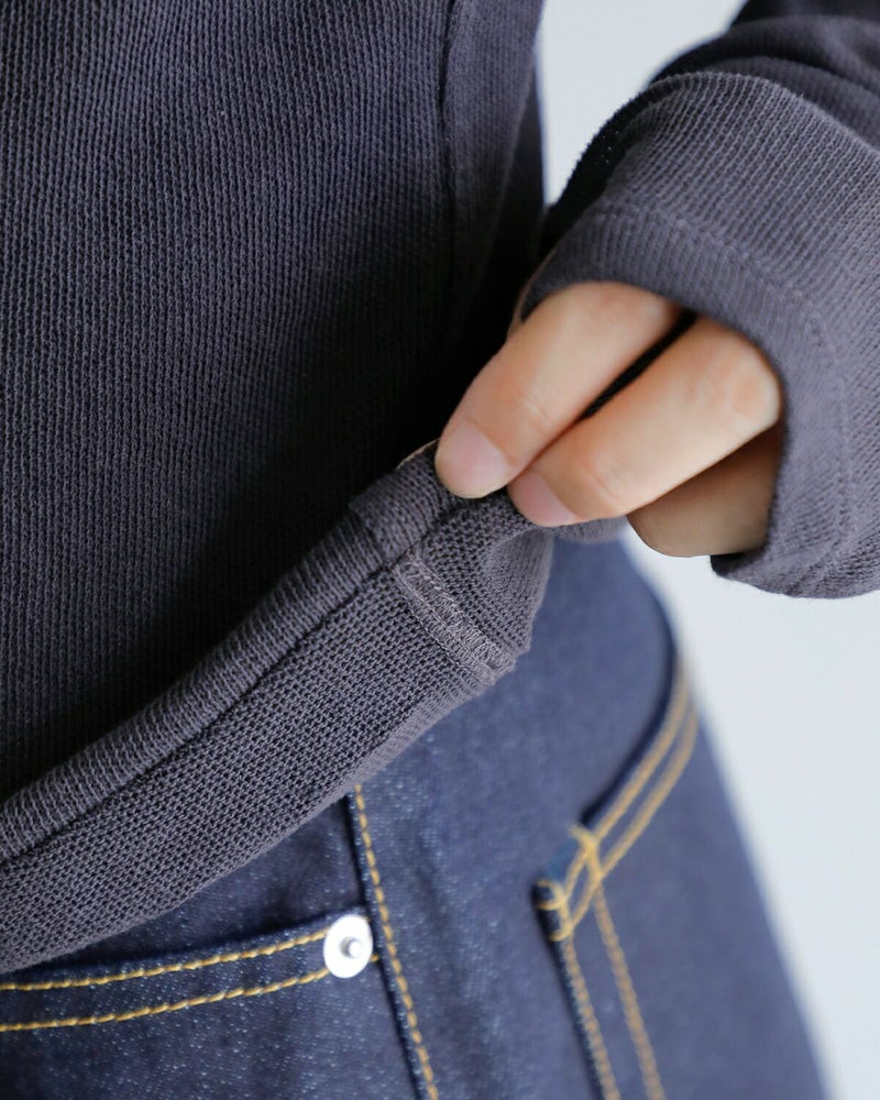 衿ぐりの見せ方によってクルーネックとVネックの2WAYを楽しめるデザインが魅力の一枚です。袖口には指抜き仕様、太幅のバインダーが施され、着こなしに程よいアクセントをプラス。素材には大正紡績による希少なスビンコットンを使用し、光沢感と柔らかさを持ちながら特殊な紡績方法により適度なハリ感を備えています。通常布帛のワークウェアに使われる太番手の糸をジャージ編みに落とし込むことで、凹凸のある独特な表情を実現。無骨さと上質さを併せ持った、ブランドならではのこだわりが詰まったプルオーバーです。