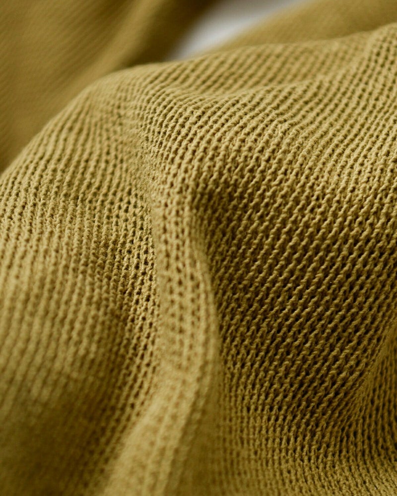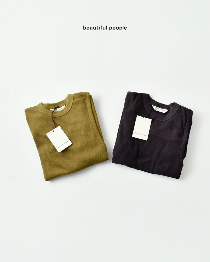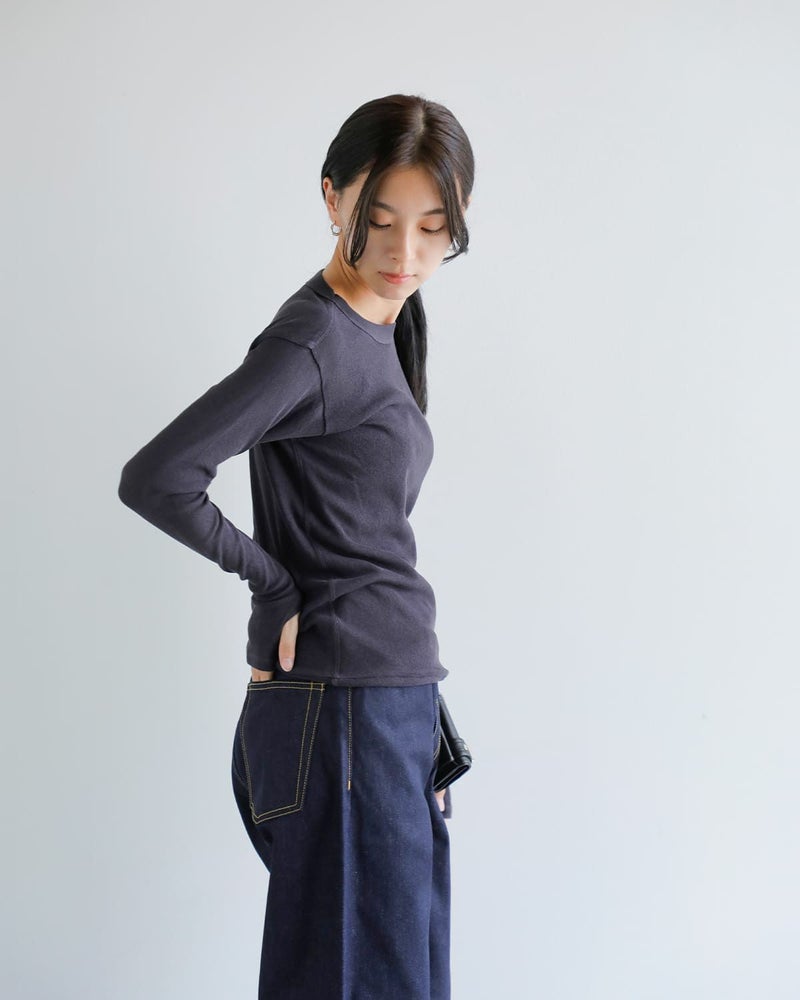 希少なスビンコットンを使用した太番手ローゲージ天竺。光沢感と柔らかさを兼ね備え、特殊な紡績方法によって適度なハリ感を実現。通常布帛ワークウェアに用いられる太番手の糸をジャージ編みにすることで、ざっくりとした凹凸のある編み目が特徴。無骨さと上質さを併せ持つ独自の風合いを生み出しています。