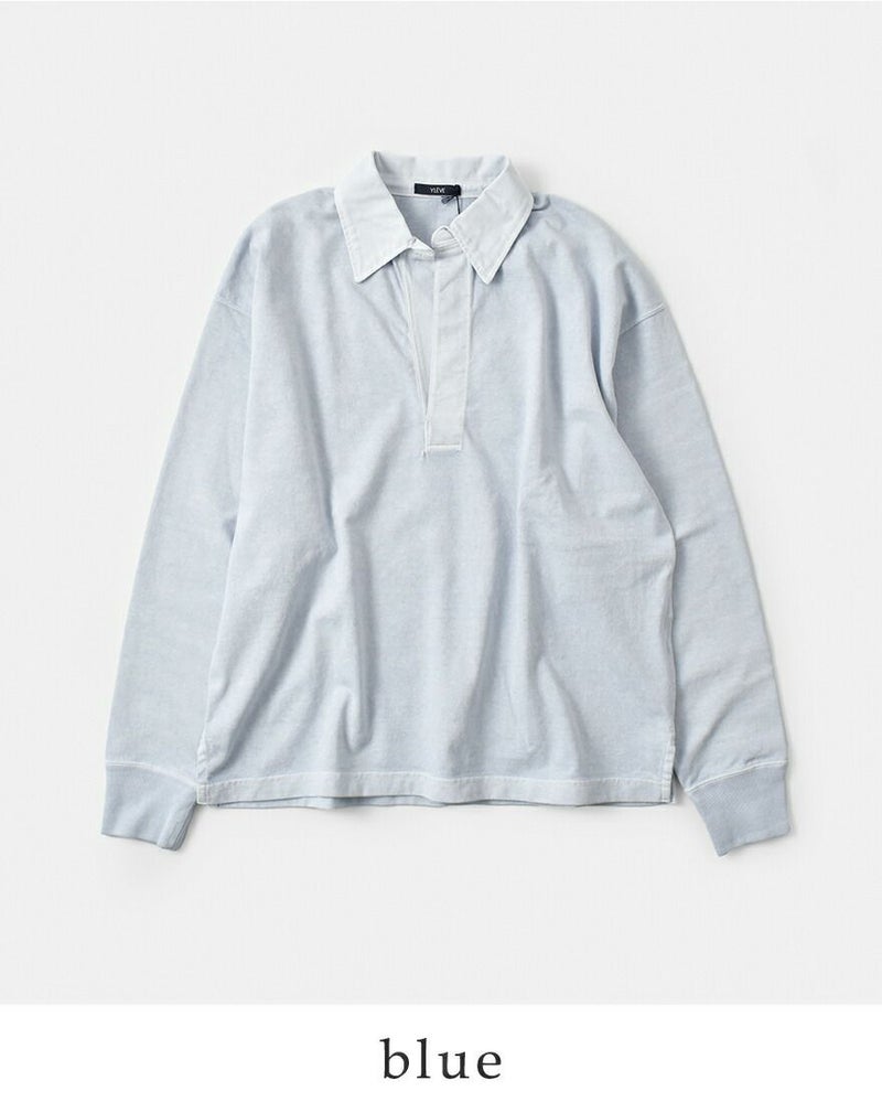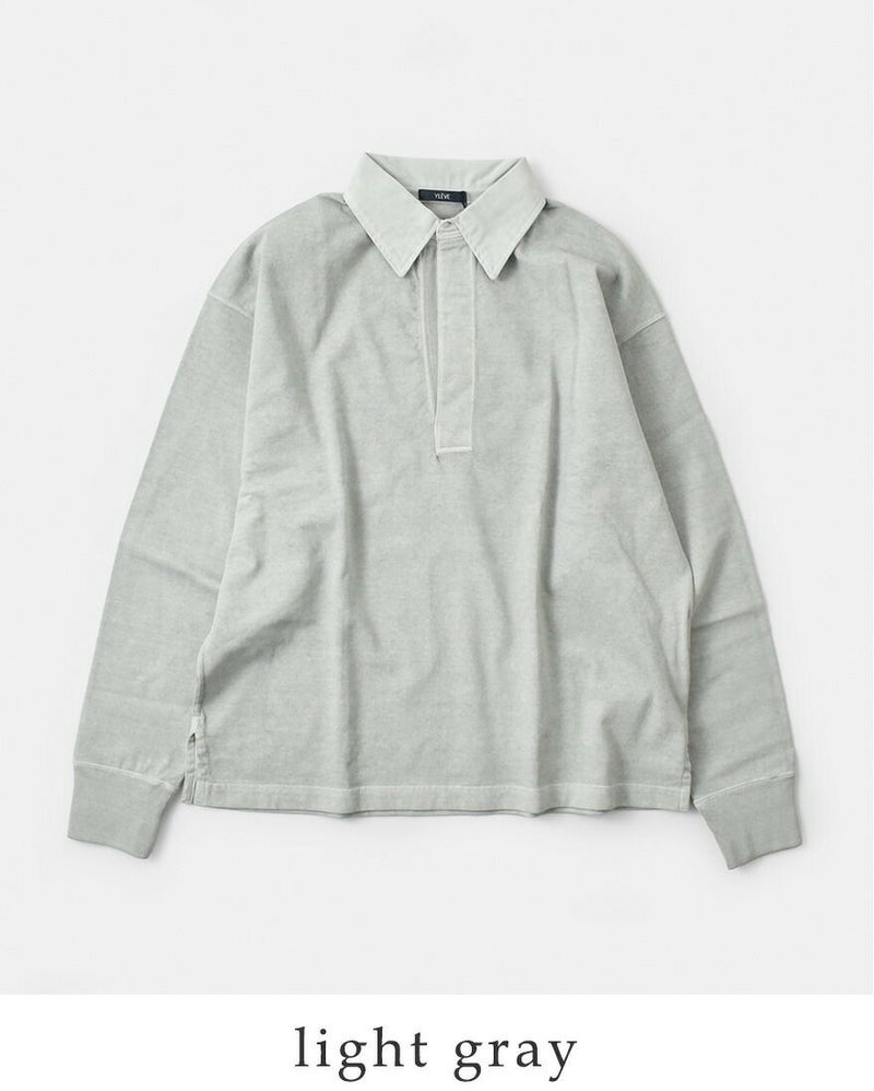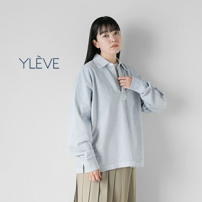 YLEVE(イレーヴ)より、コットンスキッパープルオーバーのご紹介です。生地は着るほどに味がでる空紡糸を使用しており、さらに製品で顔料染め加工を施すことでムラ感がある染まり具合が特徴です。古着のラガーシャツのディティールをベースにしつつボタンレスのデザインで、衿や前立ての染色差がアクセントになっています。ほどよいラフさのある大人カジュアルなアイテム。