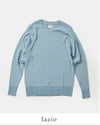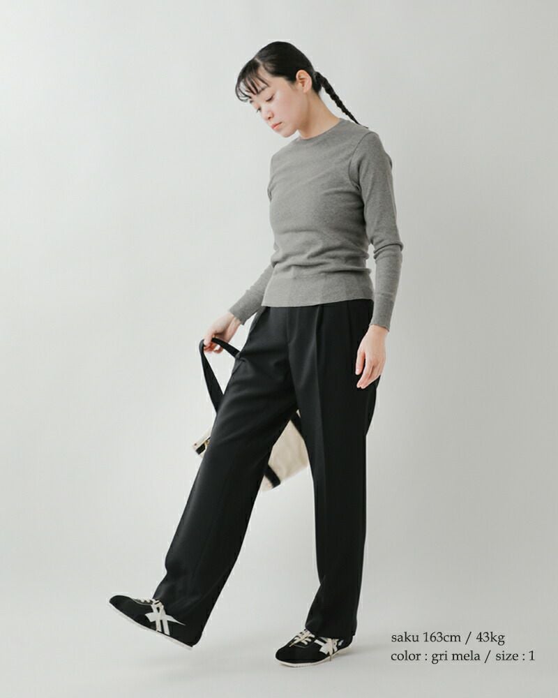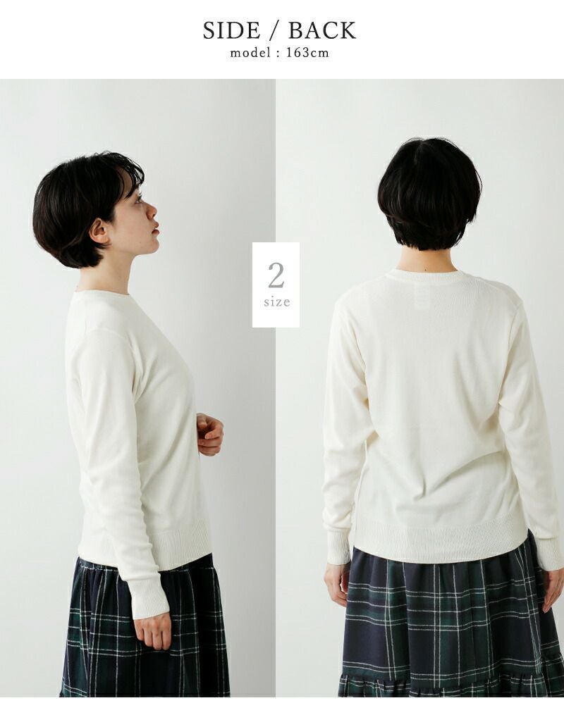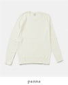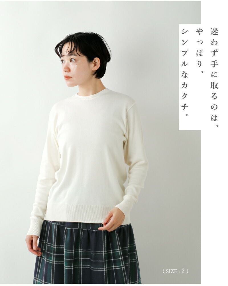 【襟】シンプルなクルーネックの襟元。程よい詰まり具合で、カーディガンなど他アイテムとレイヤードしやすい形です。2×2の襟裏に伸び留めテープを貼り付け、伸びや型崩れ防止の配慮をしています。 【袖先・裾】袖先、裾ともにシームレス2×2のリブ仕様で、やさしいフィット感があり上品な仕上がりになっています。