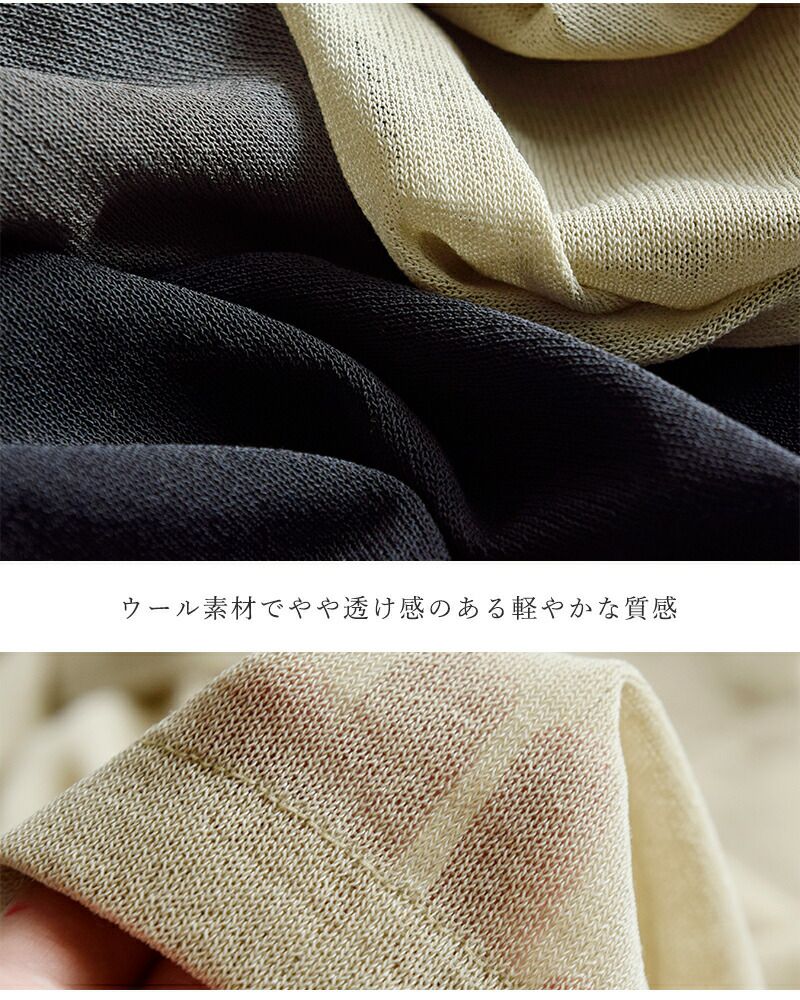 軽やかで薄手のウール素材。柔らかく肌触りが良い。適度な透け感で春・秋の羽織りに最適。