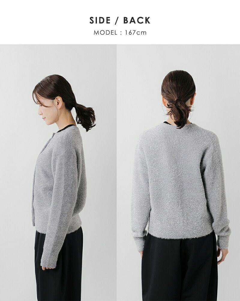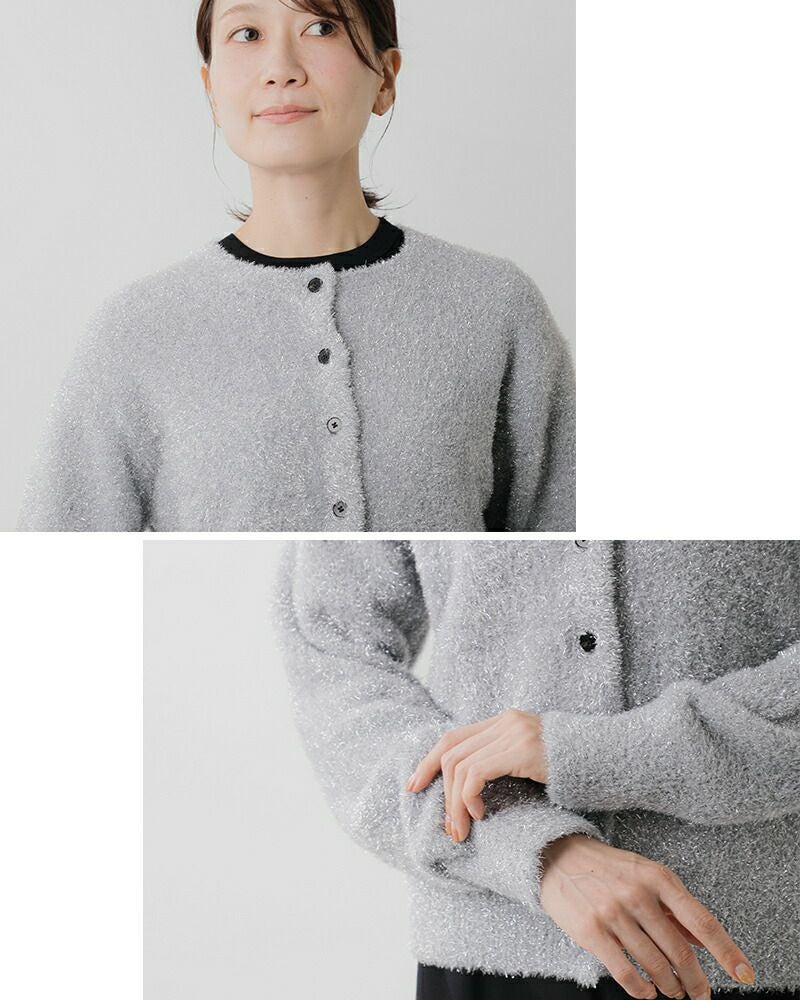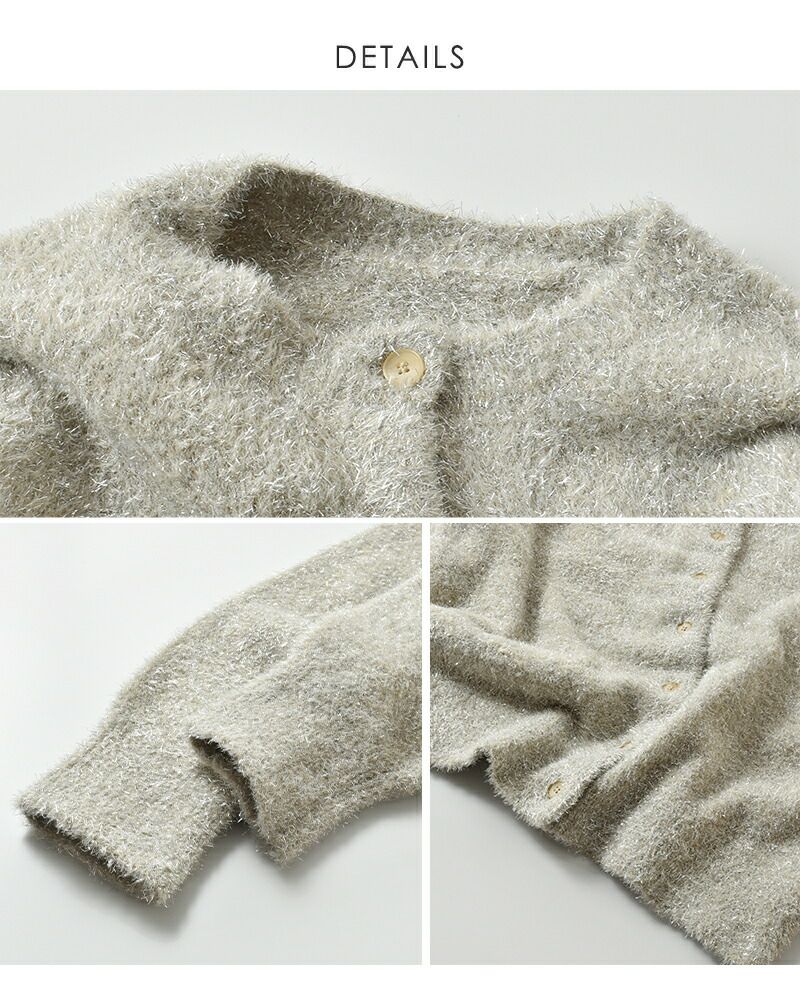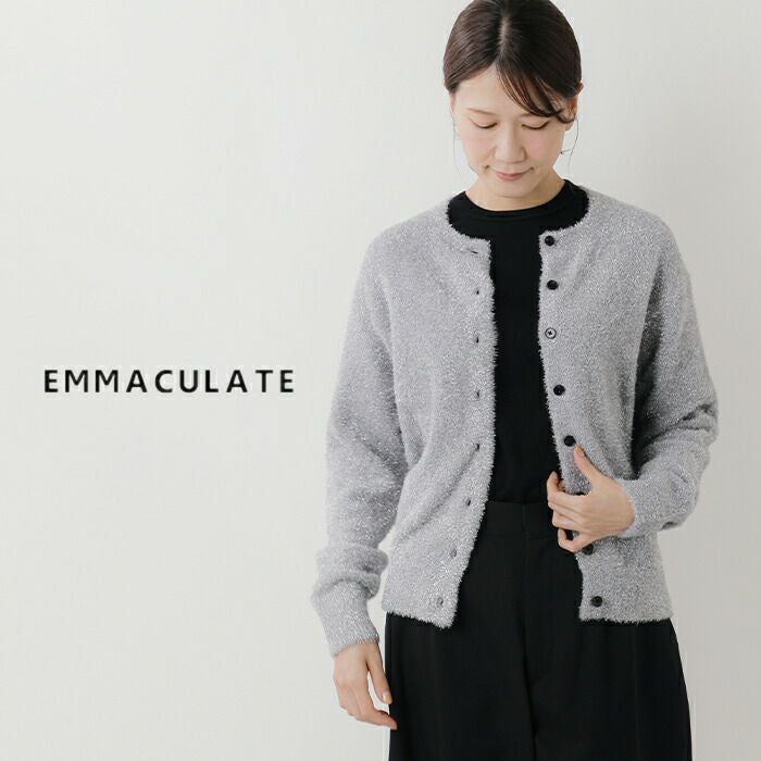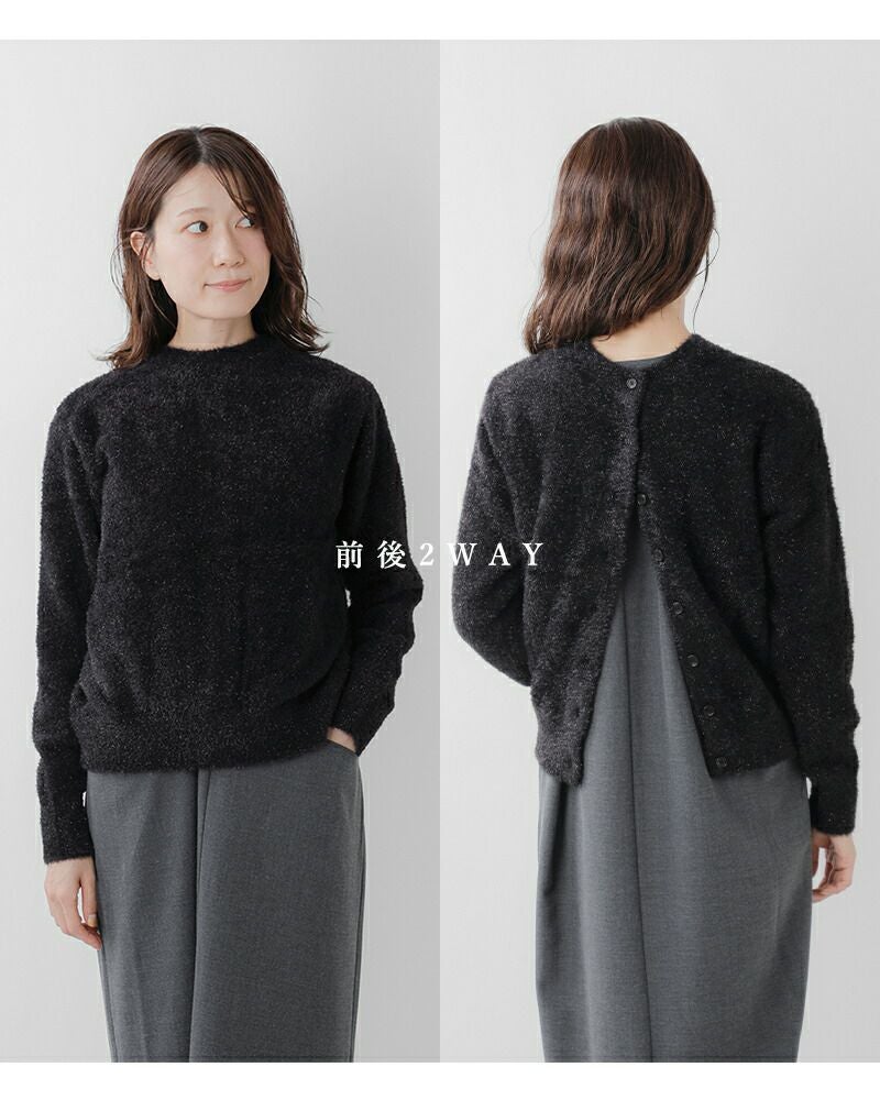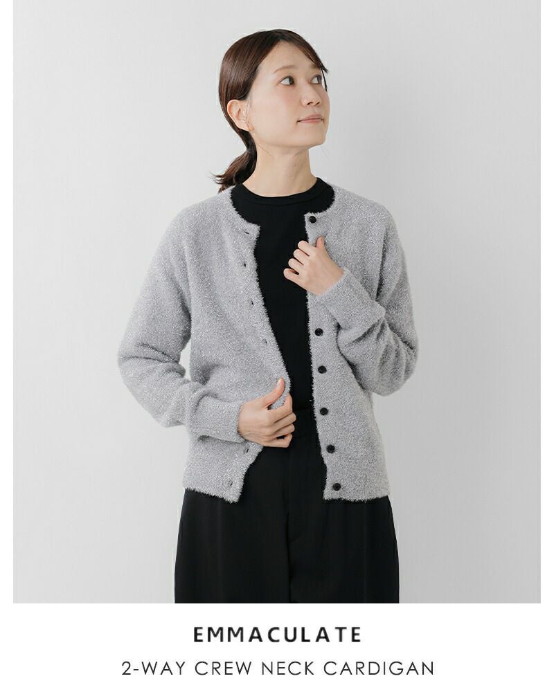 EMMACULATE(エマキュレイト)より2way クルーネック カーディガンのご紹介です。前後2wayで着ていただけるクルーネックカーディガン。毛足の長いラメフィルムを使用した華やかな素材。ラメフィルムですが、7G天竺で柔らかい仕上がりに編み立てました。少し短めの着丈は幅広いボトムと合わせて頂けます。ボタンをとめてトップス風に着ていただいたり、カーディガンとして羽織って頂いたり色々アレンジして頂けます。