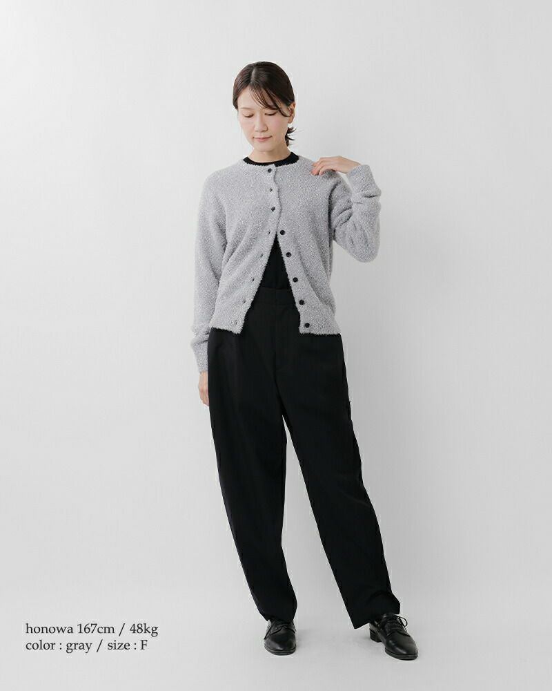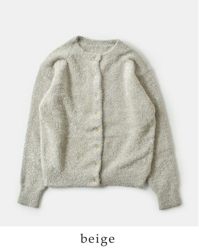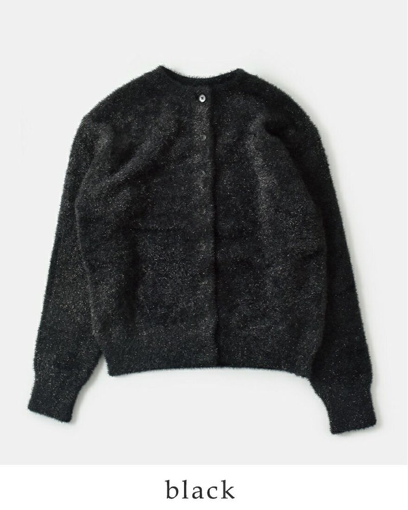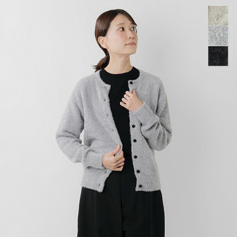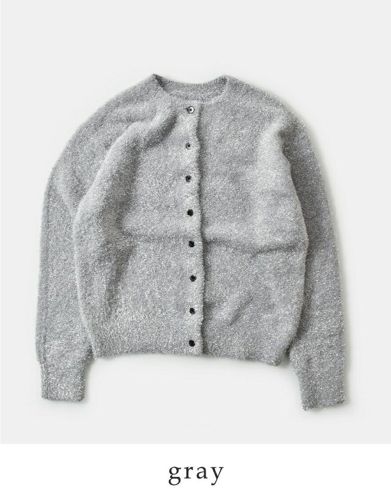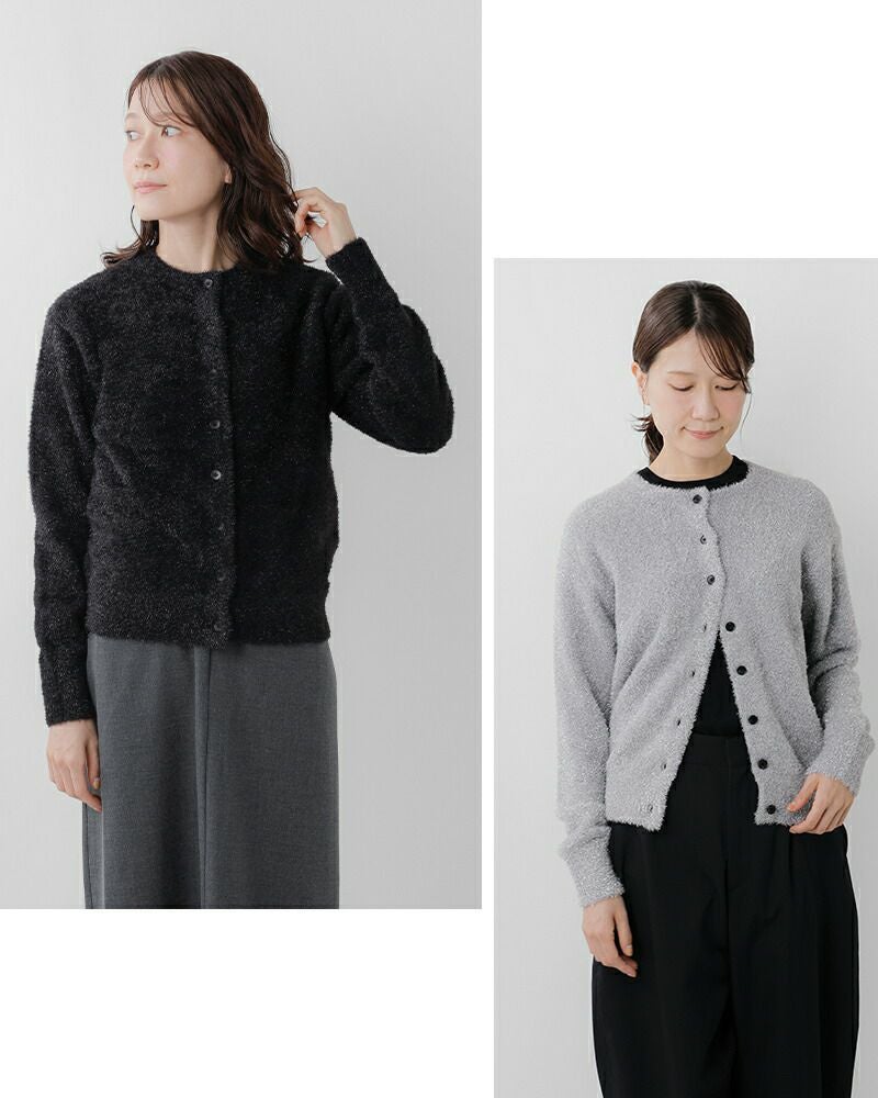 EMMACULATE(エマキュレイト)より2way クルーネック カーディガンのご紹介です。前後2wayで着ていただけるクルーネックカーディガン。毛足の長いラメフィルムを使用した華やかな素材。ラメフィルムですが、7G天竺で柔らかい仕上がりに編み立てました。少し短めの着丈は幅広いボトムと合わせて頂けます。ボタンをとめてトップス風に着ていただいたり、カーディガンとして羽織って頂いたり色々アレンジして頂けます。