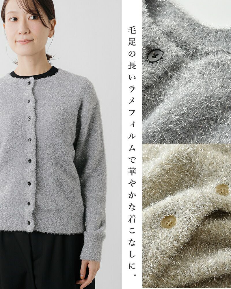 前後2wayで楽しめるデザインと、ラメフィルムのさりげないきらめき。着こなしの幅を広げながら、自然と日常に華を添えてくれるカーディガンです。シーズンを問わず長く愛用できる、特別感のあるアイテムをぜひワードローブに。
