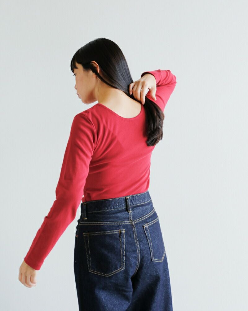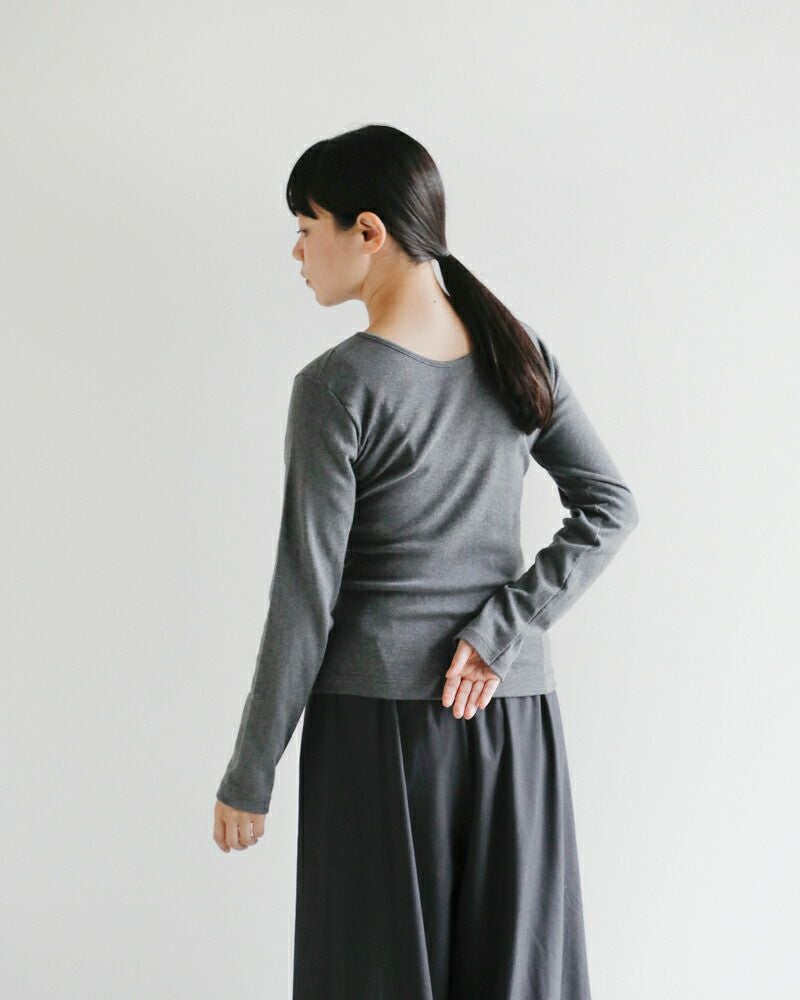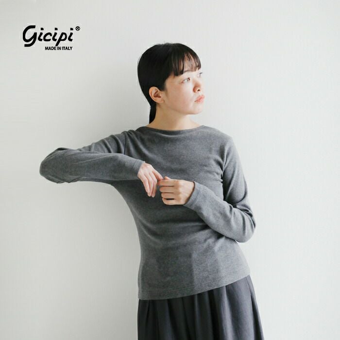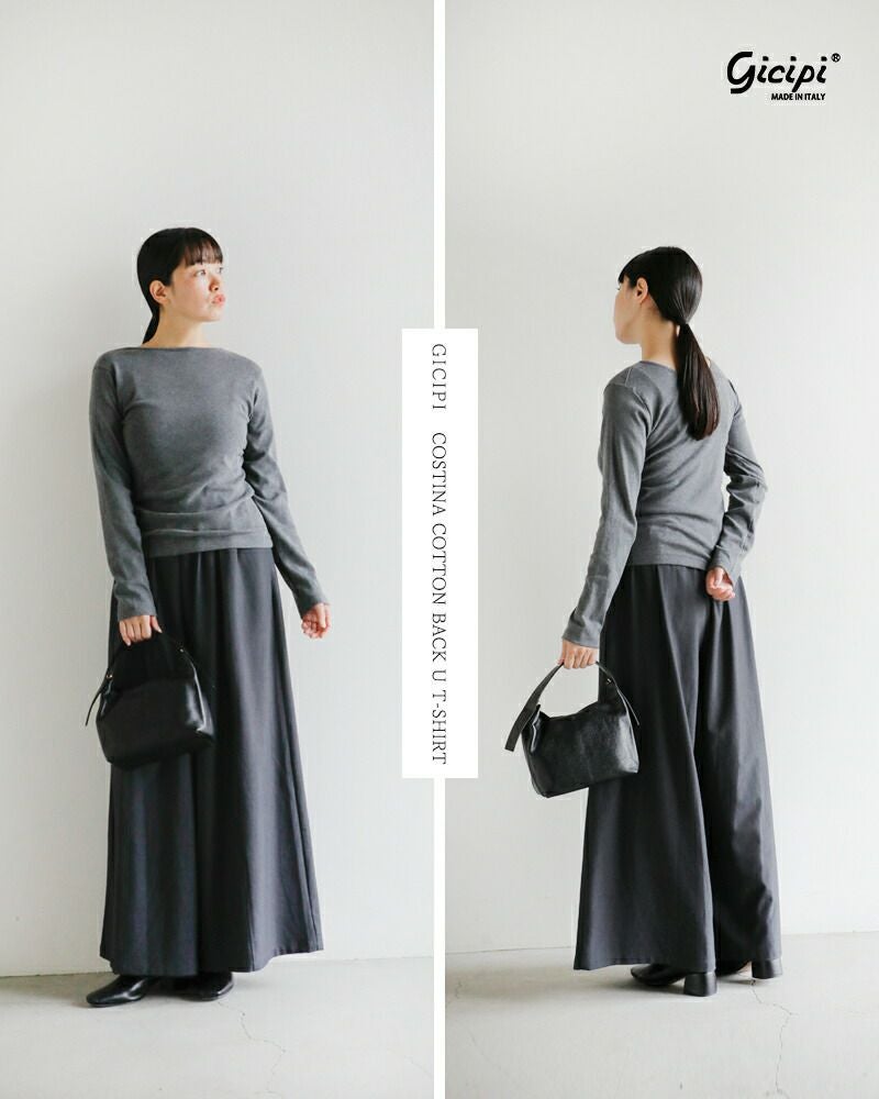 GICIPI(ジチピ)より、コスティーナ コットン バックU ロングスリーブ Tシャツ “Cece” (チェーチェ)をご紹介します。自然なフィット感あるバックUネックのTシャツ。背中の自然なU字の開きが1枚で着て様になります。程よくフィットするコンパクトめなシルエットですが、締め付け感なくインナーとしても活躍する優れたアイテムです。gicipi特有の伸縮性に優れていて着やすく、滑らかな肌触りが魅力のコットンフライス素材は着心地抜群。白でも透けにくい肉厚感なので、インナーを気にせず一枚で着こなせます。伸縮性に優れた生地で、動きやすくデイリーユースにぴったりな1枚です。