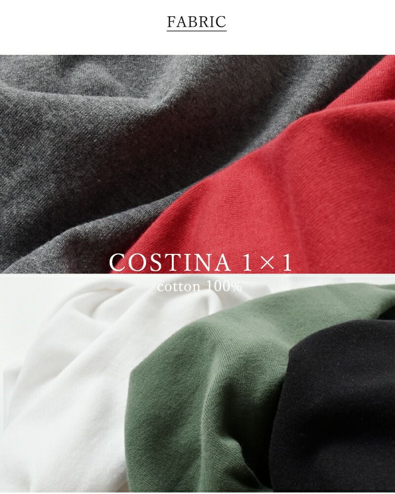 コットン100% 原産国 : イタリア ジチピオリジナルのコットンフライスCOSTINA(コスティーナ) 1×1。少し肉厚のフライス編みの生地は伸縮性に優れ、ふんわりとしていてとても滑らかな肌触りです。また水通し、タンブル乾燥しているため、縮みにくくなっています。白でも透けにくく、インナーを気にせず一枚で着こなせます。