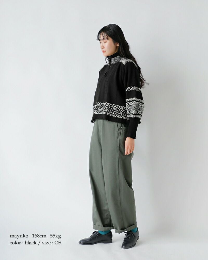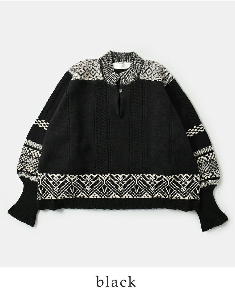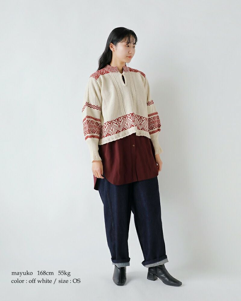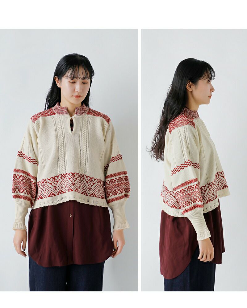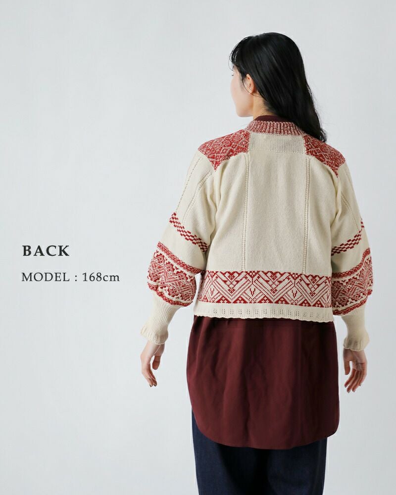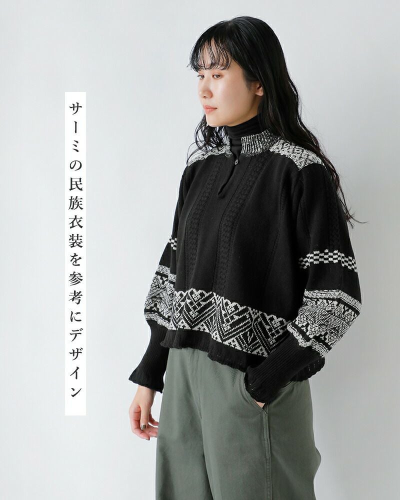 柄のデザインは、サーミ民族衣装の伝統的な装飾をもとにアレンジされたもの。袖や裾に施されたジャガード編みがオーセンティックで温かな雰囲気をまとわせます。