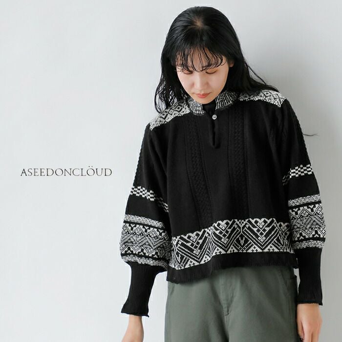 ASEEDONCLOUD(アシードンクラウド)よりセイヤコウ ジャガード ブラウス “Seiyako jacquard blouse”のご紹介です。柔らかなラムズウールを贅沢に使用し、サーミ民族衣装の意匠を取り入れた温かみのあるジャガードブラウス。生後数ヶ月の子羊から一生に一度だけ採れる極細の毛は、クリンプが未発達な分とろけるようなソフトさが特徴です。軽く優しい肌あたりと、美しい発色が魅力の一枚。伝統的な柄を現代的なシルエットに落とし込み、冬の装いに詩的なニュアンスを添えてくれます。