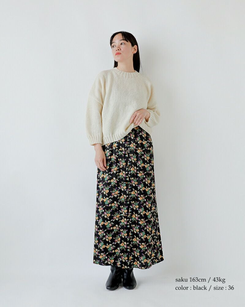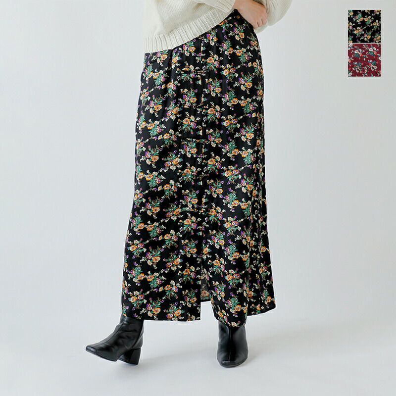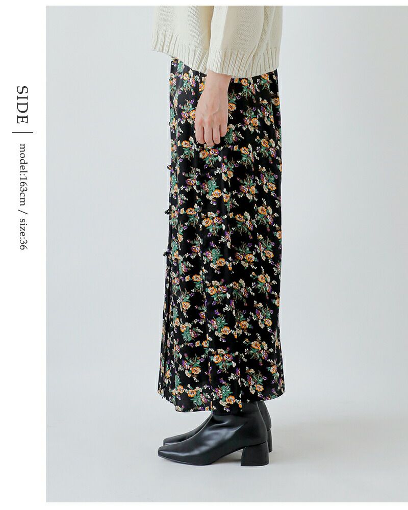 Shinzone(シンゾーン)より、フラワー ブーケプリント サテン スカート “FLOWER BOUQUET PRINTED SATIN SKIRT”のご紹介です。フロント中心にチャイナボタンをあしらったロングスカートです。ウエストには程よいギャザーを入れました。後ろのウエストは、ゴム仕様で履きやすく快適な着心地です。レーヨン100%の控えめな光沢感のサテン生地にフラワーブーケ柄をプリント。Tシャツともニットとも相性抜群の、秋の始まりにぴったりな華やかでいてシックな一枚です。