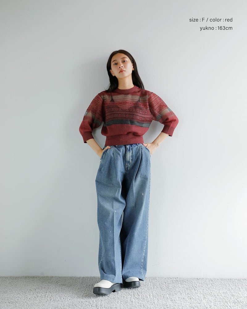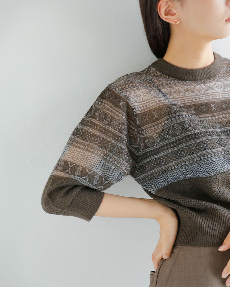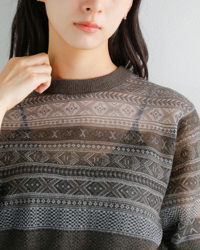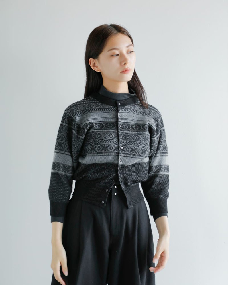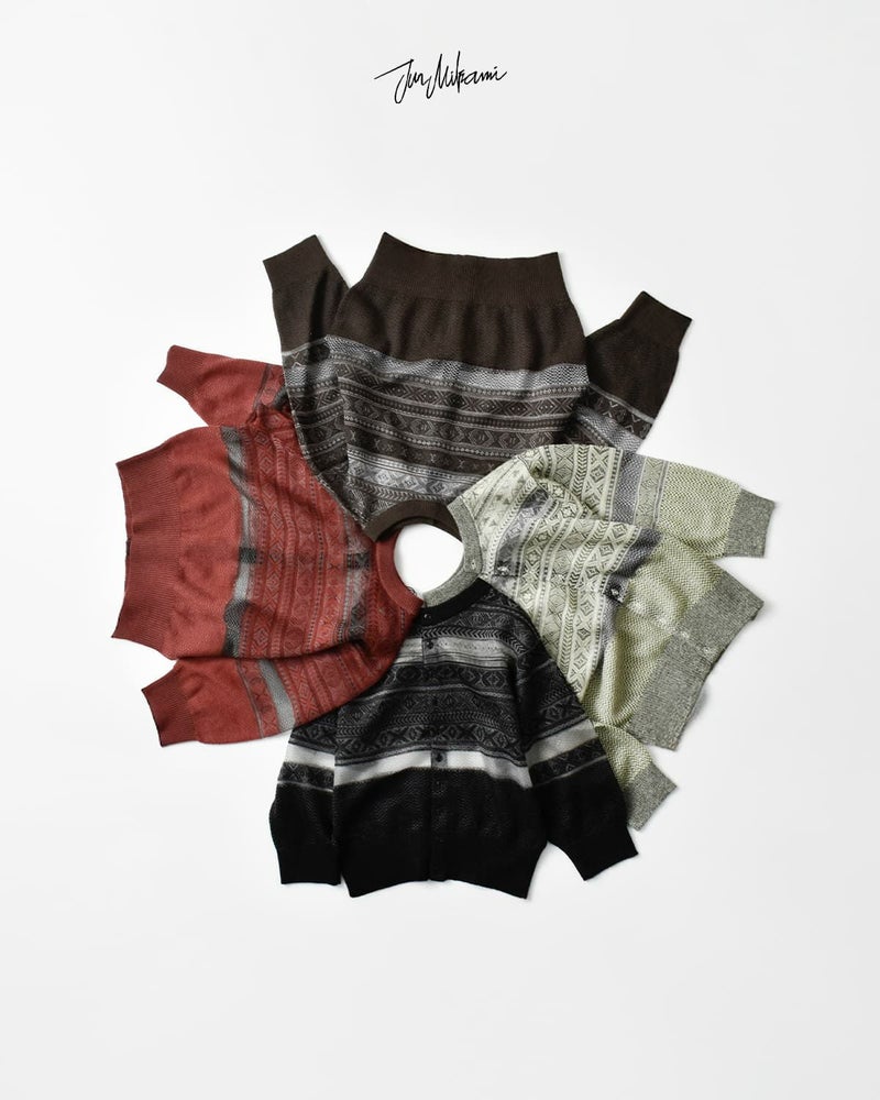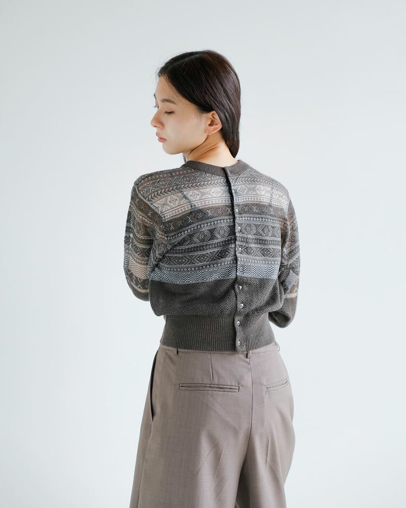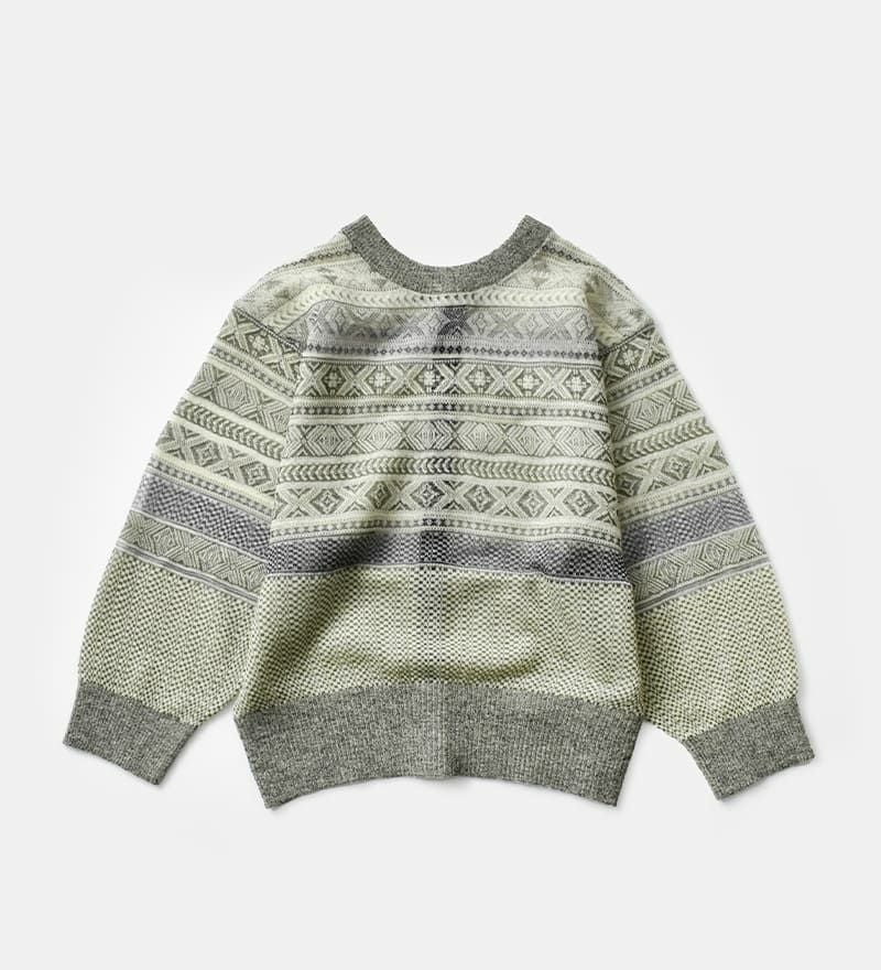 伝統的なフェアアイル柄をベースに仕上げられた一枚。クラシックな柄を引き立てながらも、モヘアをブレンドした素材使いにより、やわらかな表情と奥行きを演出しています。美しいシアー感と季節感を感じさせる豊かな色合い、上品で落ち着いた雰囲気が魅力のアイテムです。前後どちらを前にしても着用できるデザインの一枚。ボタン開閉のカーディガン面とシンプルなプルオーバーの2wayで楽しめます。