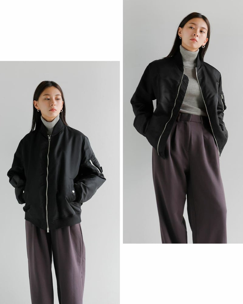 上品なツヤと軽やかな素材感が特徴の、女性らしいミリタリースタイルを楽しめるフライトジャケット。甘さを抑えた大人の雰囲気で、モードにもカジュアルにも馴染む印象です。
