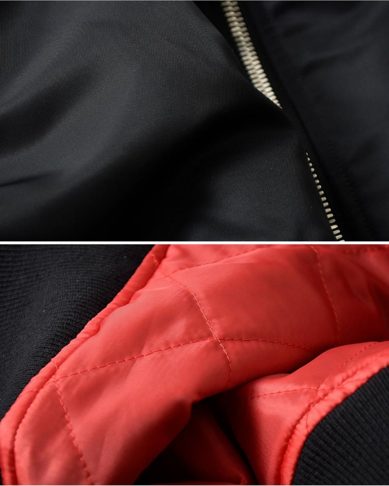 ナイロン100%を綾織りで高密度に織り上げ、後染めで仕上げた素材で、表面はコンパクトでクリアな質感。一般的なMA-1素材に比べて軽く、滑らかな風合いが特徴のジャケットです。