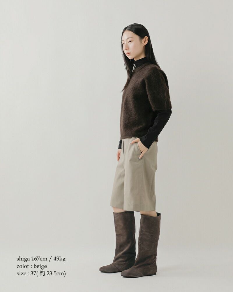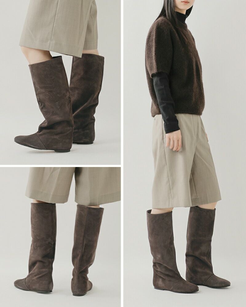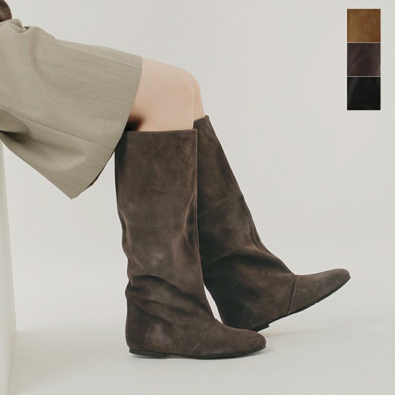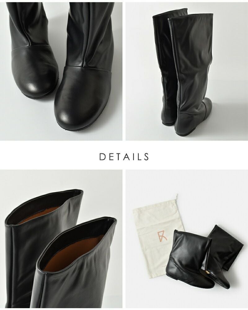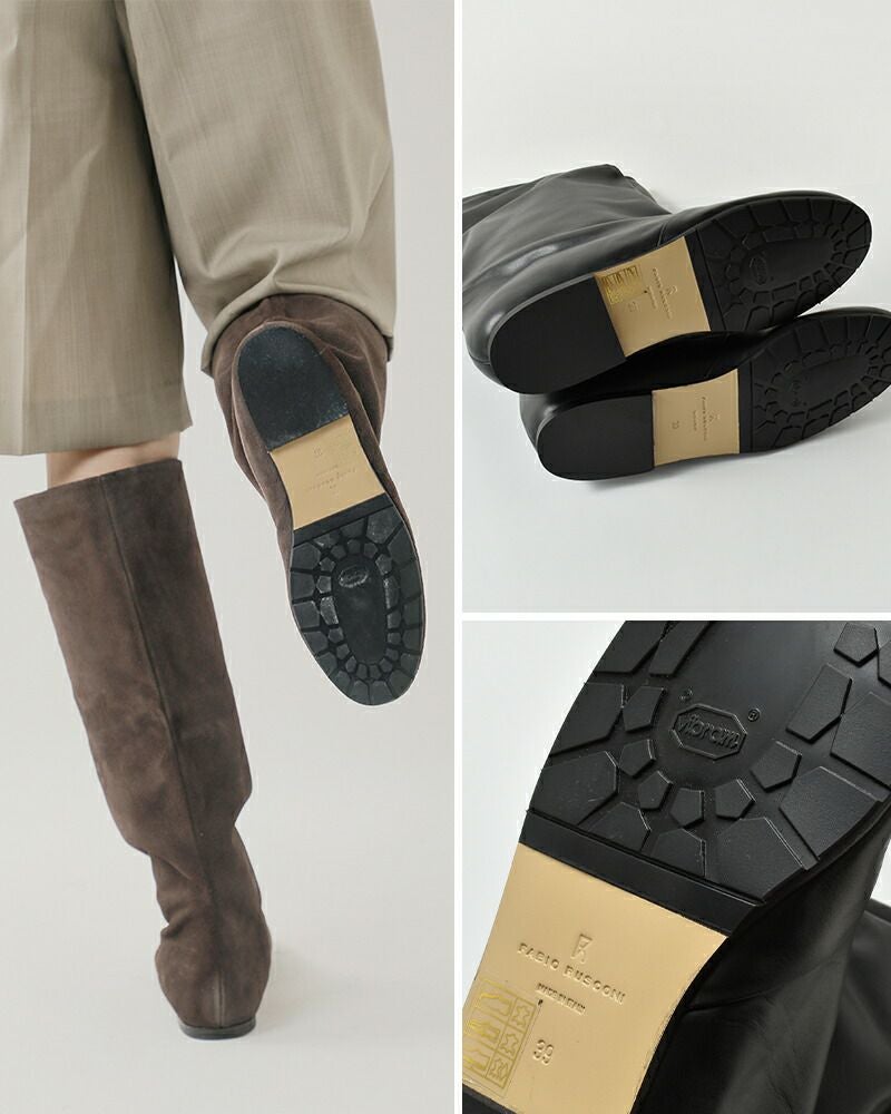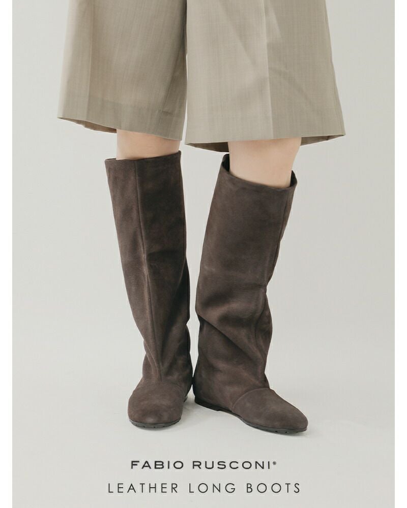 FABIO RUSCONI(ファビオルスコーニ)よりレザー ロング ブーツのご紹介です。上質なレザーで仕立てたロングブーツ。無駄のないすっきりとしたフォルムが脚を美しく引き立て、どんなスタイルにも自然に溶け込むシンプルなデザイン。柔らかく足に馴染む天然皮革が上品な艶とぬくもりを添え、履くほどに風合いを増していきます。さらに、安定感のあるフラットソールが歩きやすさを実現し、デイリーからお出かけまで快適に活躍。スカートやワンピースはもちろん、パンツインスタイルにも映える万能な一足です。
