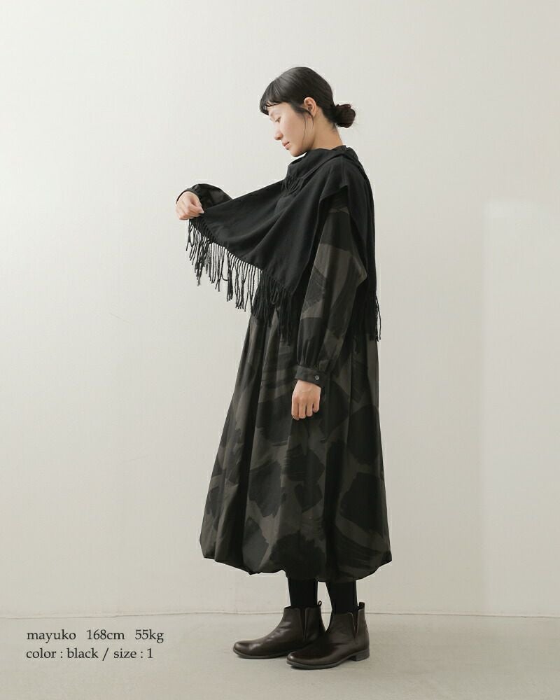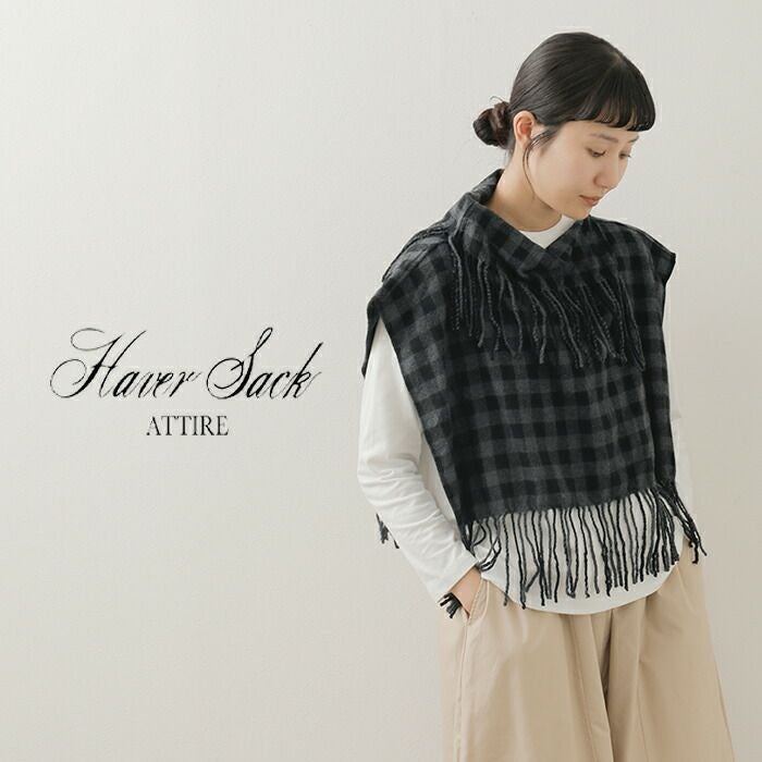 HAVERSACK ATTIRE(ハバーサック アタイア)よりウール フリンジ ネックウォーマーのご紹介です。柔らかく保温性に優れたウール素材を使用し、首元をやさしく包み込んでくれるプルオーバータイプのネックウォーマー。頭からすぽっとかぶるだけで、防寒とレイヤード風のスタイリングを一度に楽しめるのが魅力です。暖かさは欲しいけれどコートやマフラーでは少し重たく感じる方、室内で身軽に過ごしたい方、デスクワークや家事などで手元の動きを妨げたくない方にもぴったり。着用する向きを変えるだけで印象をアレンジできるのも嬉しいポイントです。シンプルながらフリンジがアクセントになった、機能性とデザイン性を両立した大人のための防寒アイテム。ユニセックスで使える、冬の新定番です。