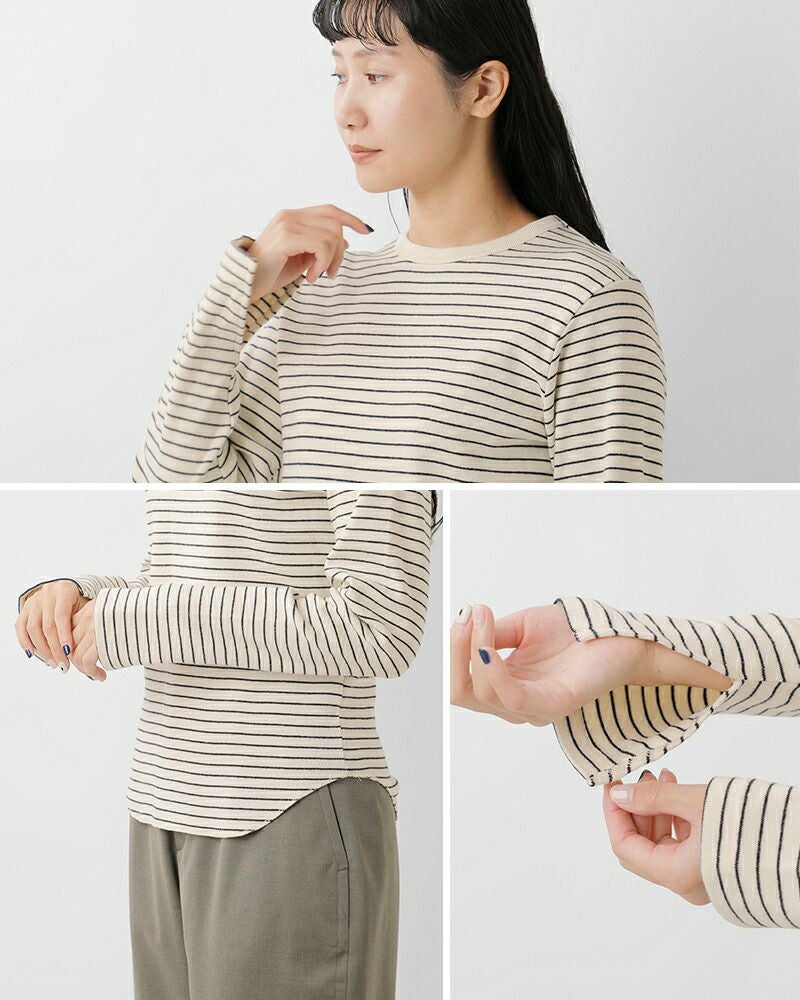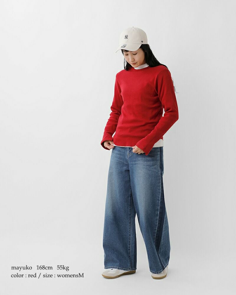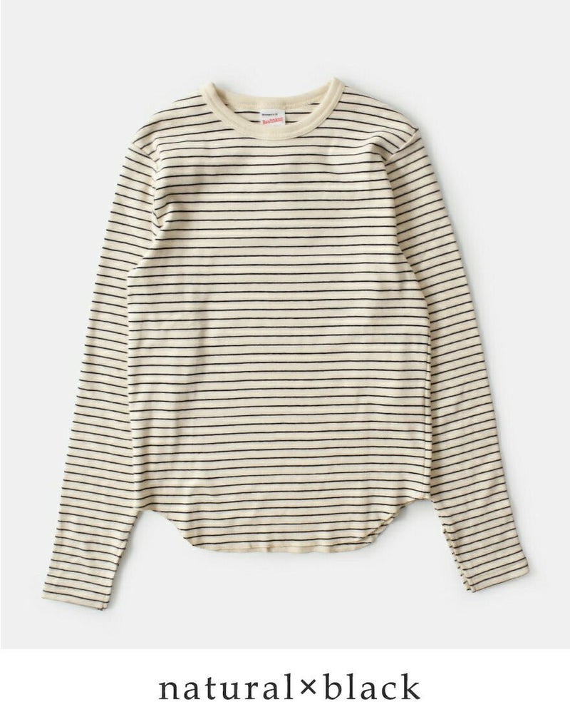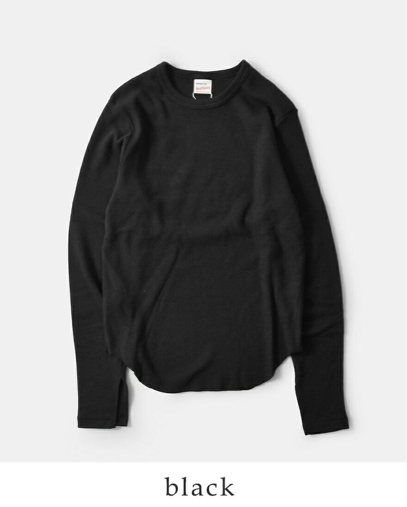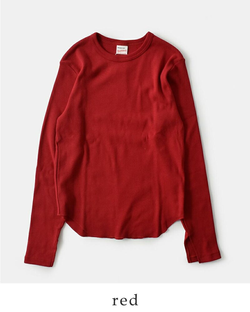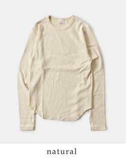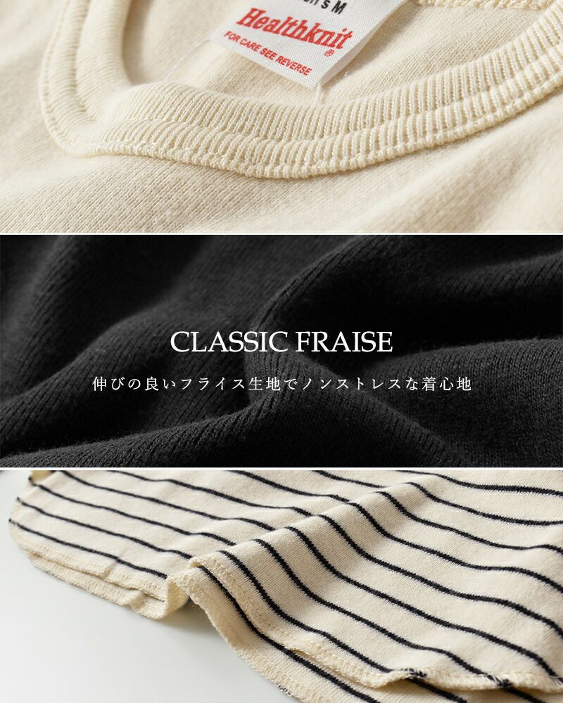 Healthknit(ヘルスニット)よりクラシック フライス クルーネック 長袖 Tシャツのご紹介です。ヘルスニットの歴史において長らく主力商品としてラインナップされ高い人気を誇った肉厚のコットンフライス素材をリプロダクトした一枚。当時の素朴な素材感を目指し、あえて不均一な糸を使用しています。透け感のないしっかりとした肉感ですが、伸びの良いフライス編みでノンストレスな着用感。身体のラインを拾わないサイズ感で、インナーとしてもトップスとしても活躍します。袖口のスリットと丸みを持ったヘムラインで、下に白のインナーを合わせるだけでこなれた印象に。