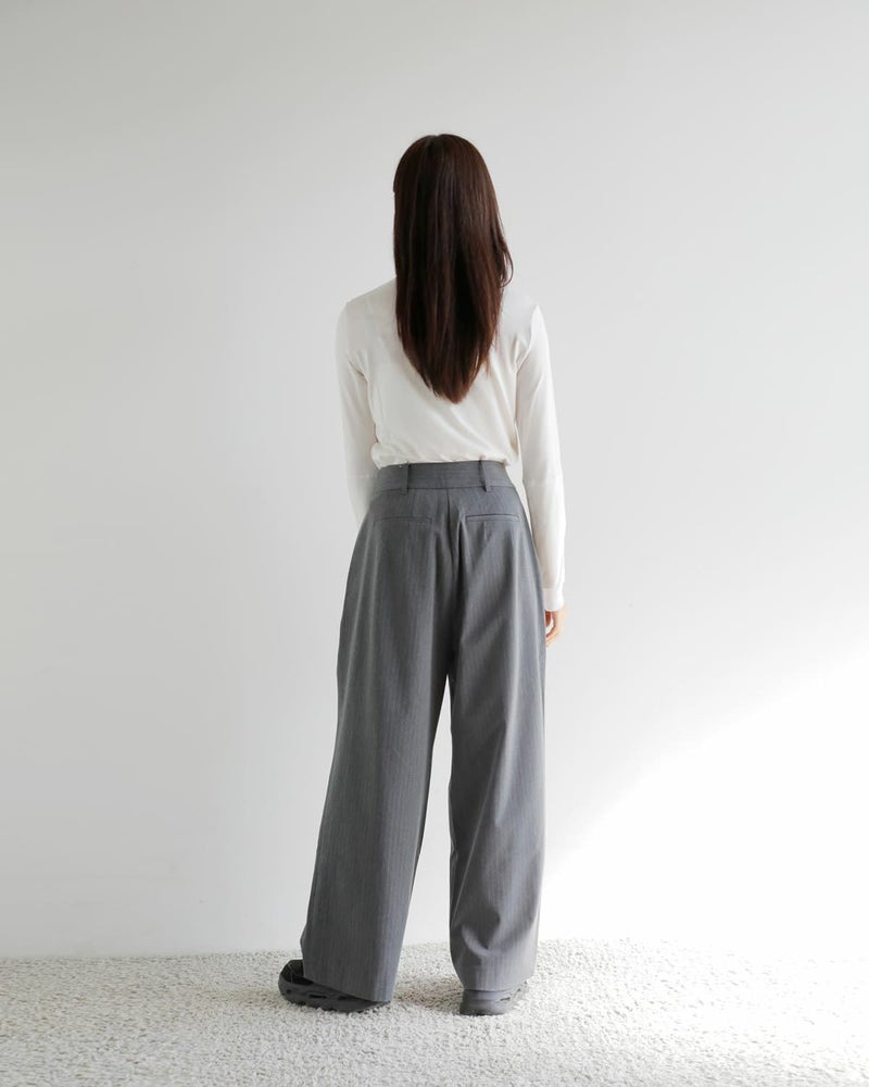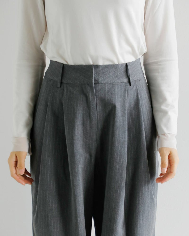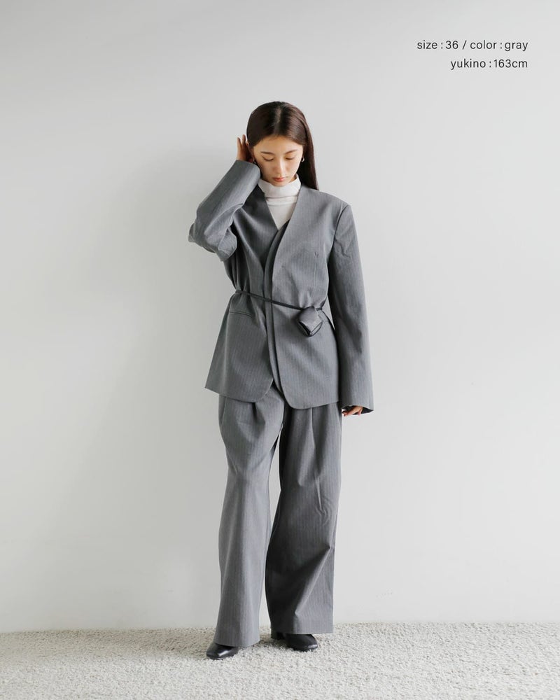 ストレッチ性のある平織りの杢調素材で仕上げたワイドパンツ。ダブルタックデザインで、シンプルなディテールとこなれ感の出るラフなシルエットが、コーディネートの幅を広げてくれる一本。しわになりにくく、肌触りが心地良い点も魅力。同素材のCollarless Over Jacketとセットアップで着るのもおすすめ。グレーは細ラインのストライプ素材。チャコールグレーは少しブルー味のあるなんとも言えない絶妙な色合いで、着るだけで洒落感の出るカラーです。