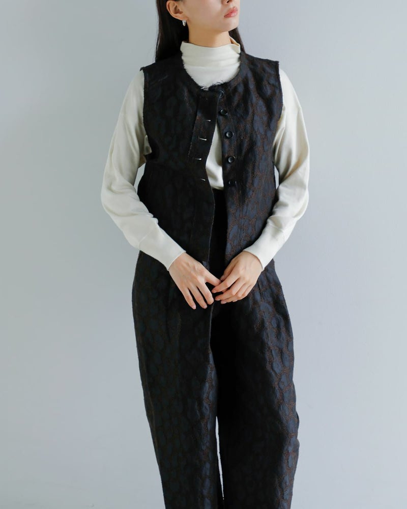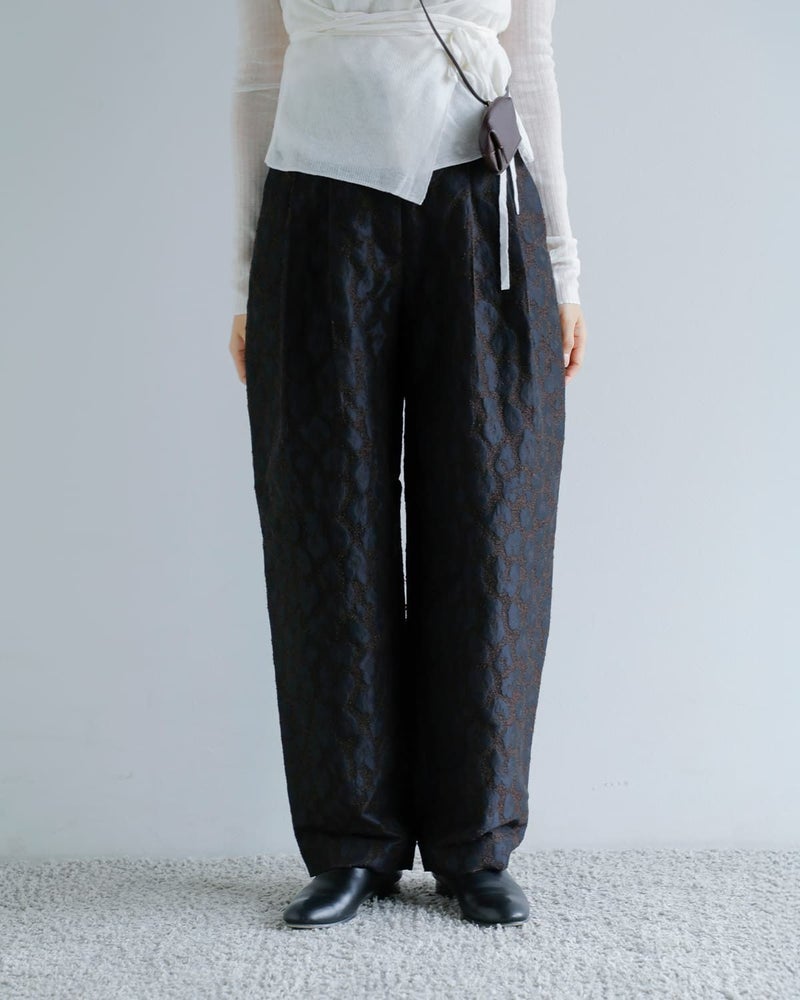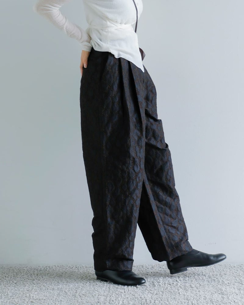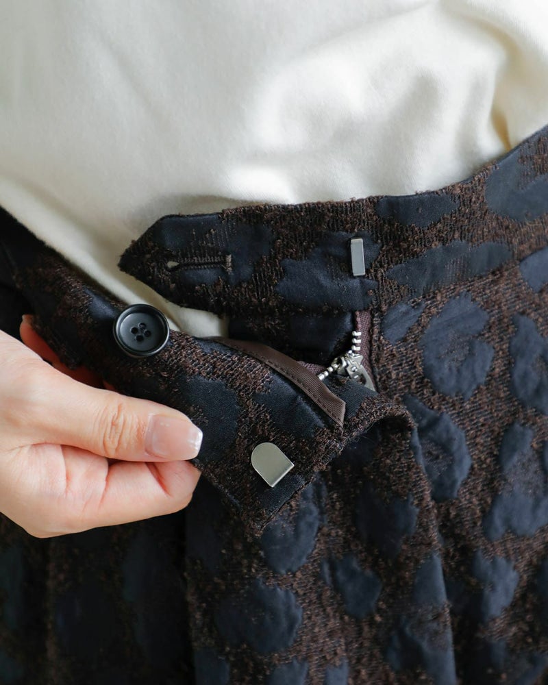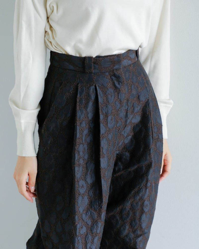 シックな配色で仕上げたレオパード柄パンツ。桐生で織り上げたオリジナルの国内素材。細いループ糸と微光沢糸を使い、立体感あるジャガード生地です。派手過ぎないレオパード柄で上品に着ていただけます。フォルムの出る少しハリのある素材で、ダブルタックを入れたコクーンシルエットに仕上げました。同素材のLeopard Jacquard Vestとセットアップで着るのもおすすめです。