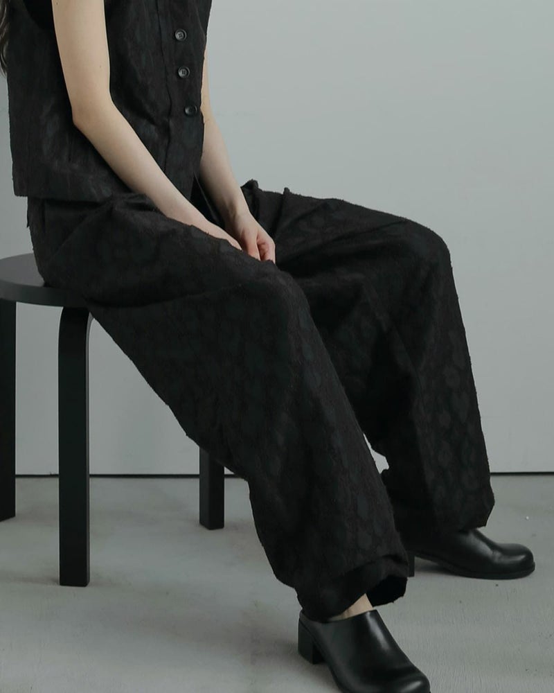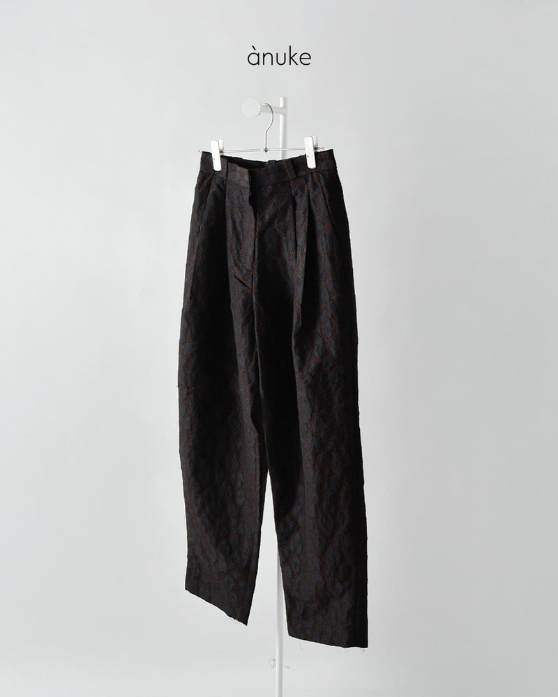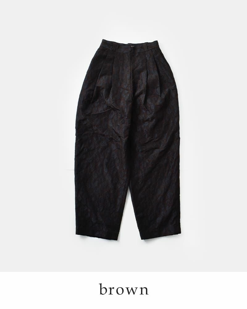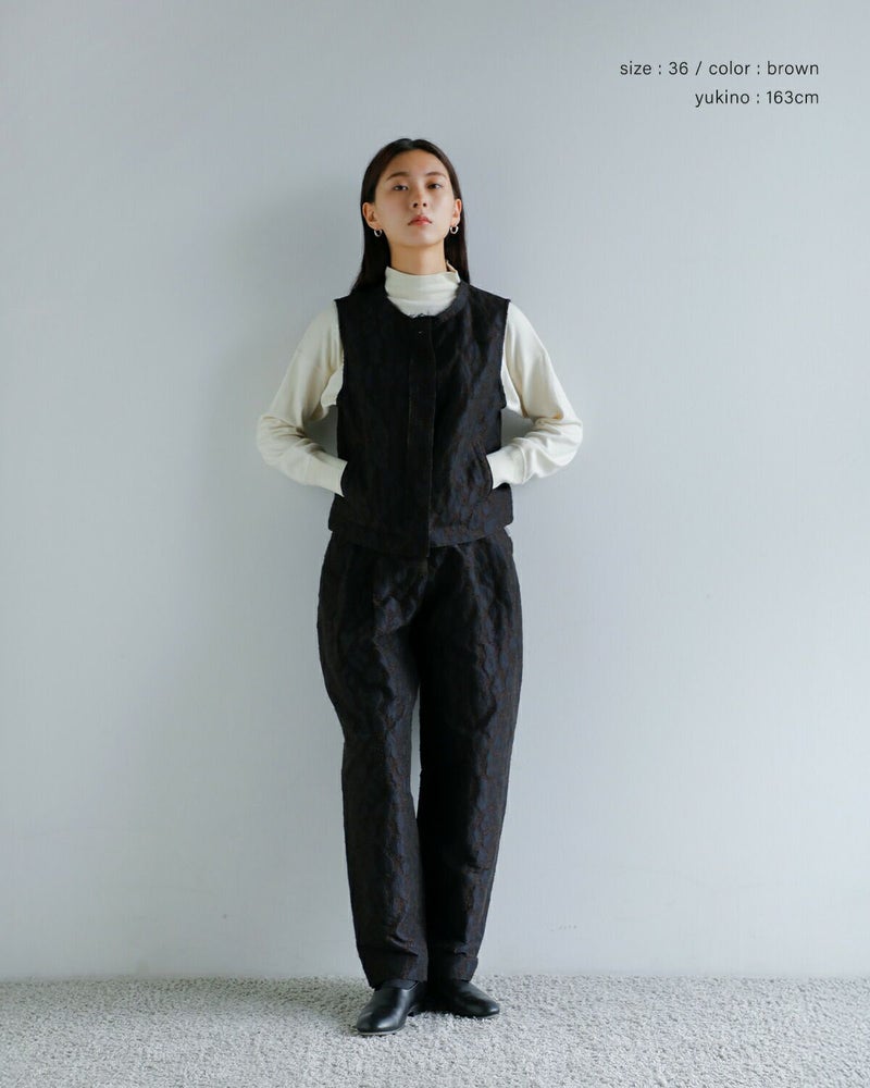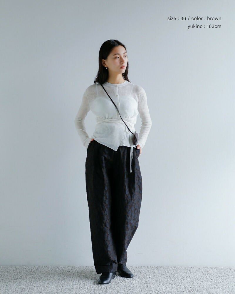 シックな配色で仕上げたレオパード柄パンツ。桐生で織り上げたオリジナルの国内素材。細いループ糸と微光沢糸を使い、立体感あるジャガード生地です。派手過ぎないレオパード柄で上品に着ていただけます。フォルムの出る少しハリのある素材で、ダブルタックを入れたコクーンシルエットに仕上げました。同素材のLeopard Jacquard Vestとセットアップで着るのもおすすめです。