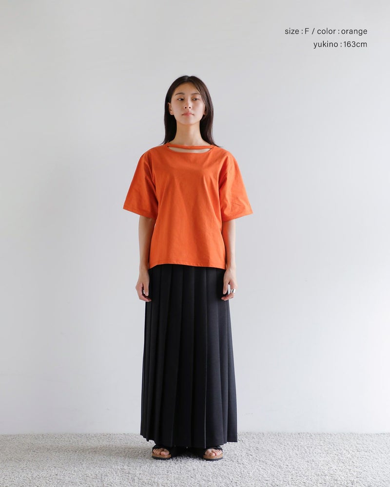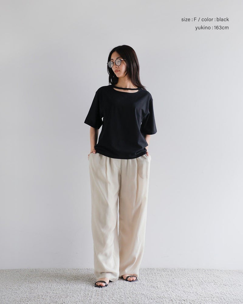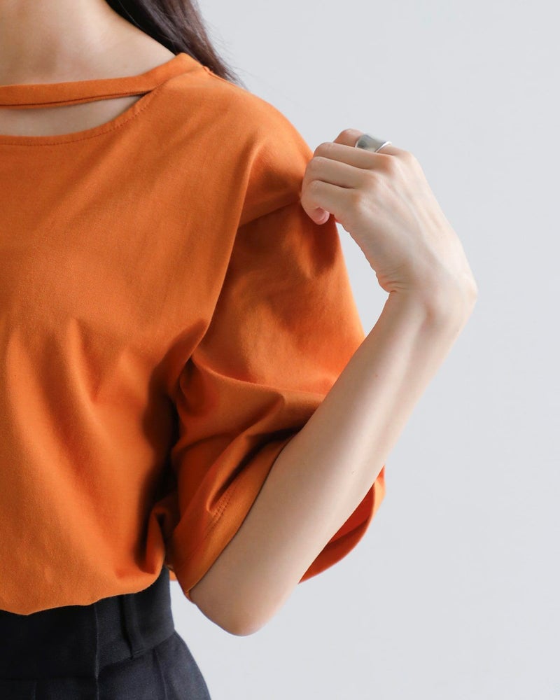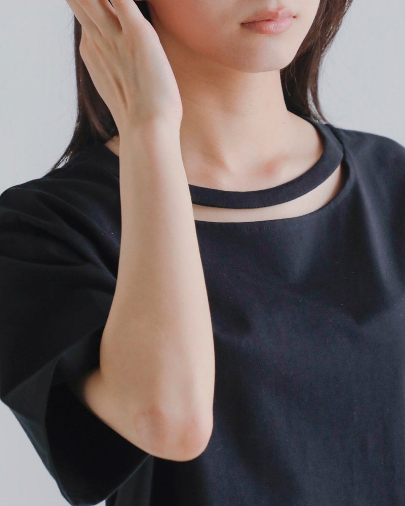 三日月型のスリットが施されたネックライン。程よい肌見せで抜け感を演出。