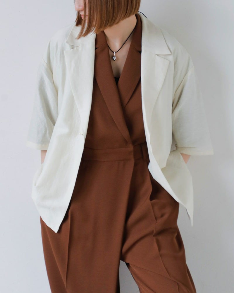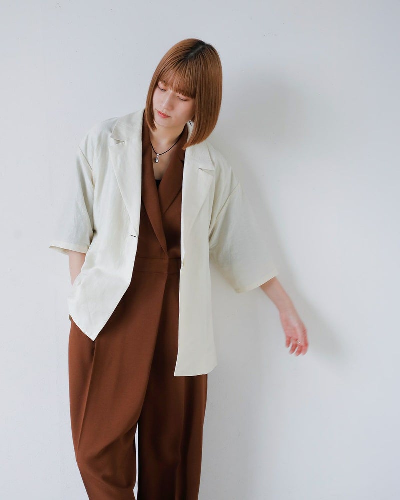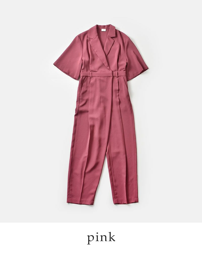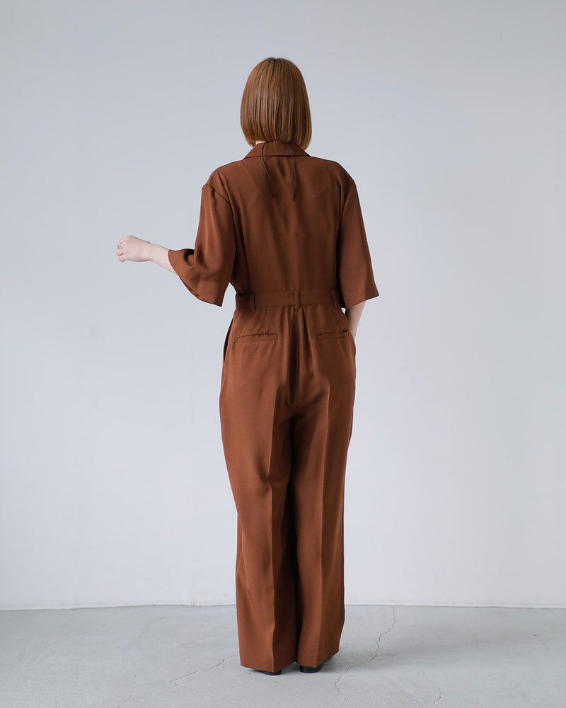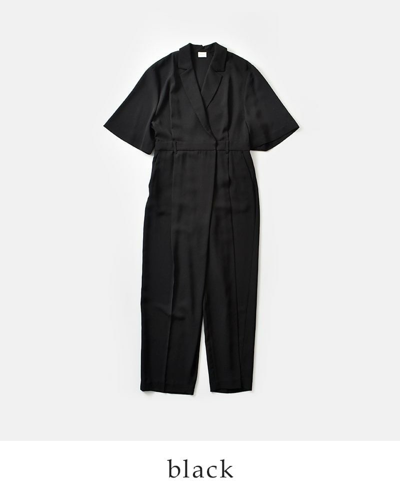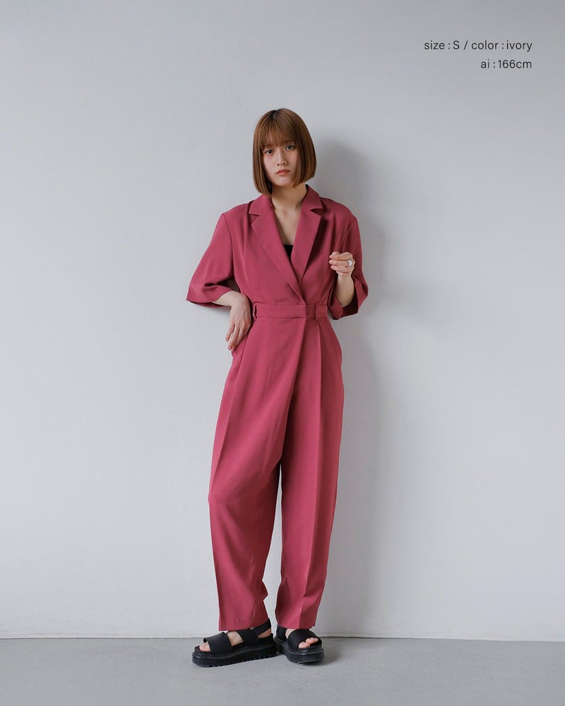 マニッシュなディテールが際立つ、テーラード仕立てのオールインワン。ほどよいルーズさとリラックス感がありながらも、洗練された印象を演出します。内蔵されたウエストゴムでシルエットに変化をつけられ、ブラウジングすれば女性らしさも引き立つ着こなしに。