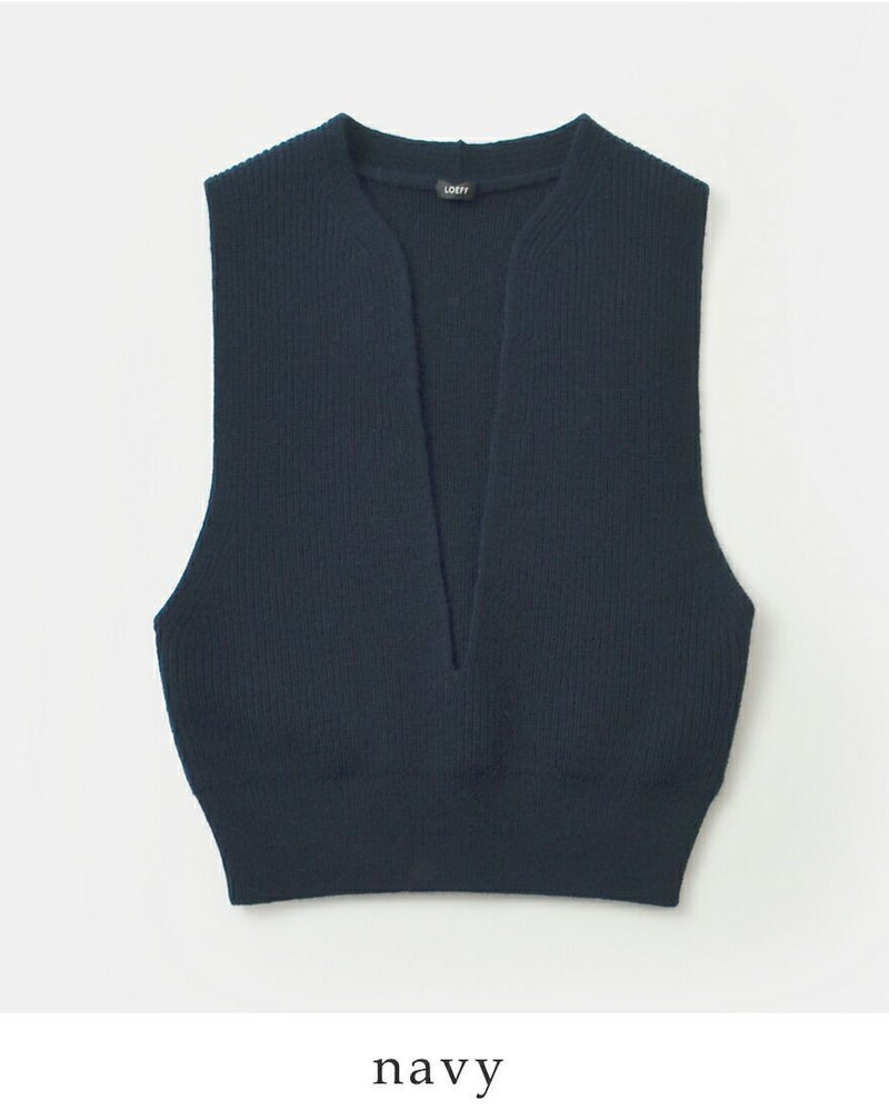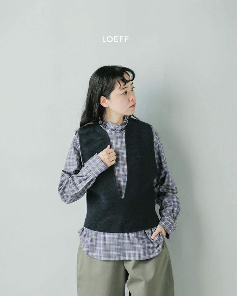 LOEFF(ロエフ)より、ウールヤーン畔編スリットネックベストのご紹介です。ふくらみのあるウールヤーンを超度詰めで畔編みにしたベスト。ヴィンテージ感もありつつ、がっしりとした風合いが魅力。編み続きの胸元の深いスリットがポイントの、様々なレイヤードに便利なニットベストです。