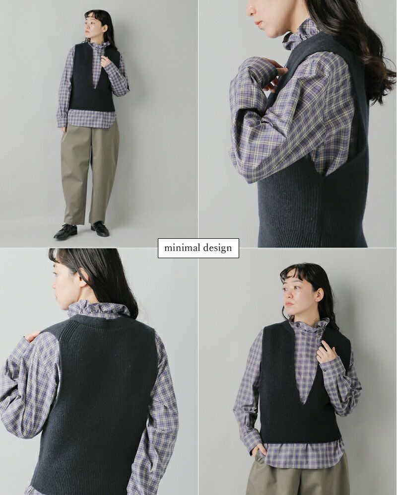 ゆったりとしたボディに、深く開いたVネックが印象的なニットベスト。洗練されたストンとしたシルエットと、直線的なラインがミニマルな雰囲気を演出します。レイヤード次第で、さまざまな表情の着こなしが楽しめます。