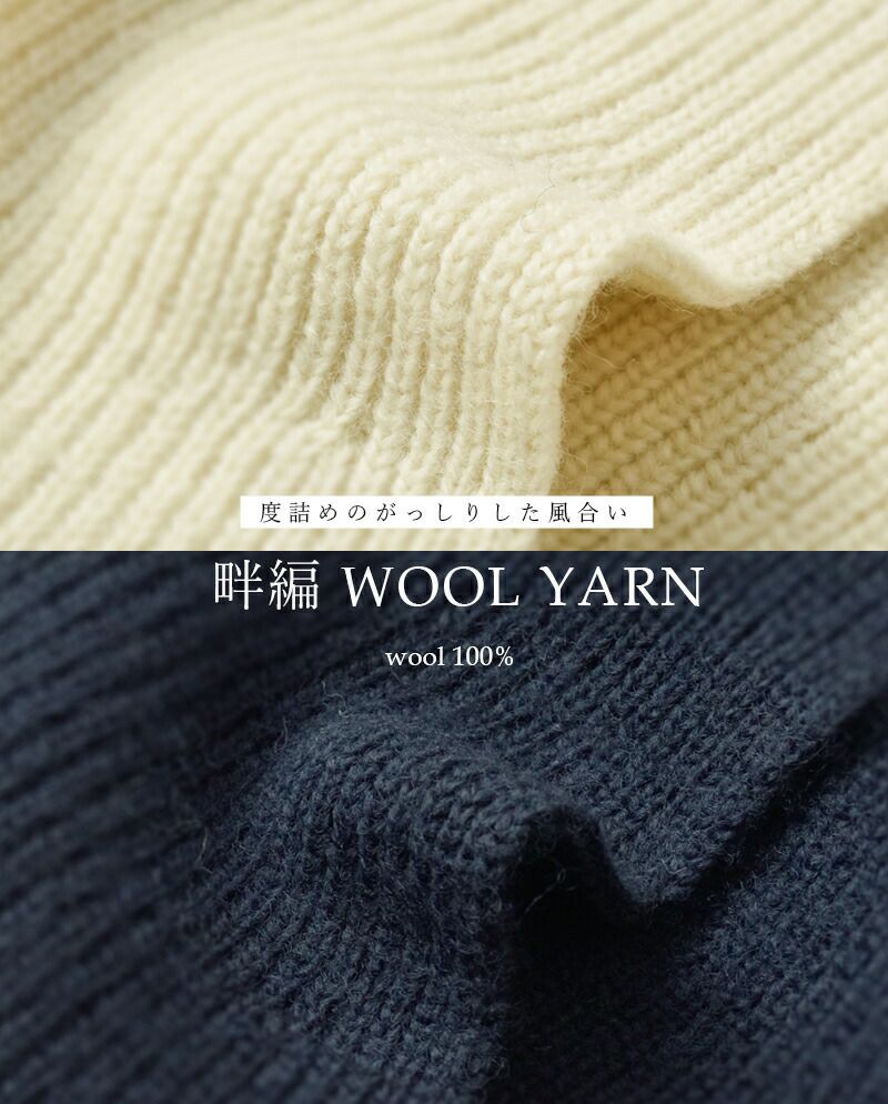 ふくらみのあるウールヤーンを超度詰で畔編みで仕上げたニット。肉厚でがっしりしたあたたかな風合い。ウール100%で保温性が高く、度詰め仕様で隙間風もブロック。ちくちく感の少ない滑らかな肌触りで着心地も抜群です。