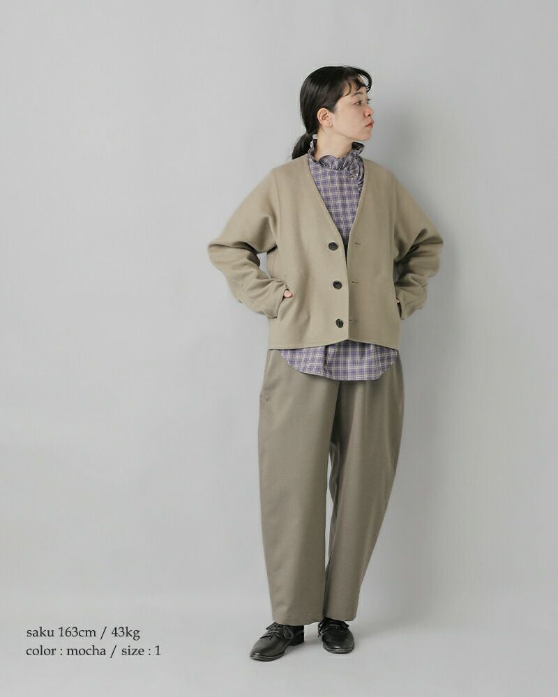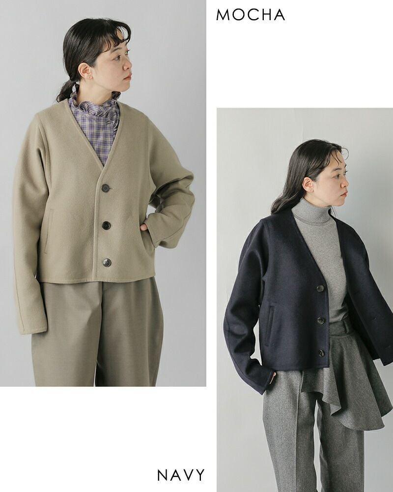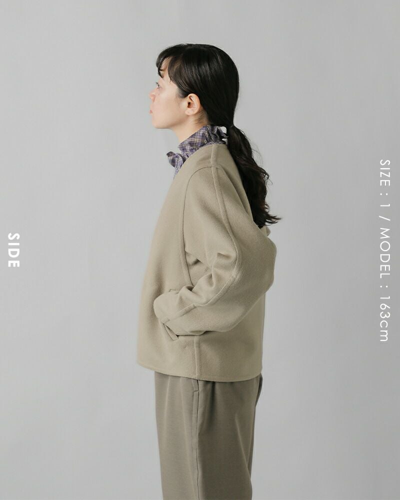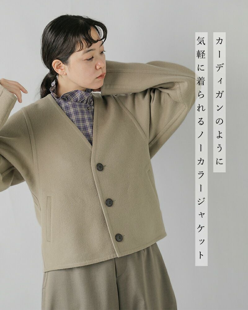 リバー縫製で素材の柔らかさを活かした軽くて羽織りやすいカーディガン感覚のノーカラージャケット。