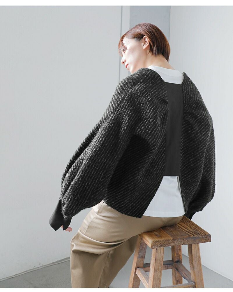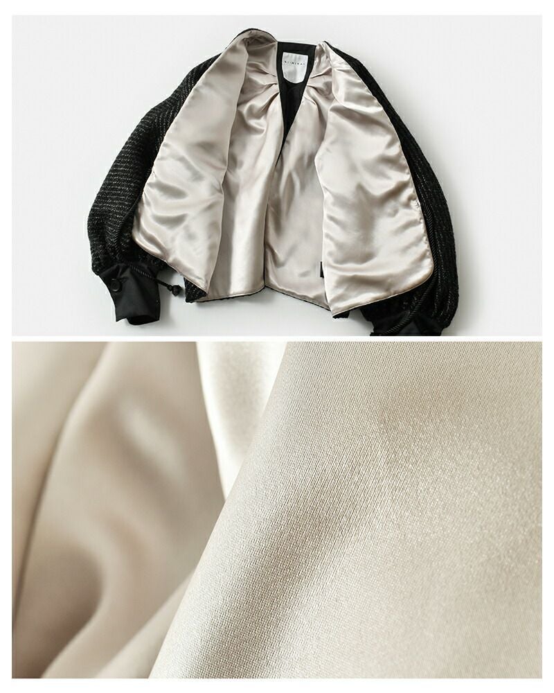 SI-HIRAI(スーヒライ)よりウール スパーキーカルゼ/ヘリンボーン ショートジャケットのご紹介です。やや丸みを帯びたシルエットに、コンパクトな着丈が印象的なショートジャケット。奥行きのある生地感が季節感ある着こなしに。フロントはドローストリングで軽やかに留める仕様。袖先のカフスや立体的なボリューム袖が、さりげないアクセントをプラスします。背面には、表地と異なるコットン素材で切り替えを施しており、後ろ姿にもさりげない個性と抜け感を演出。秋冬のレイヤードスタイルに取り入れやすく、ワンピースやワイドパンツとのバランスも絶妙です。