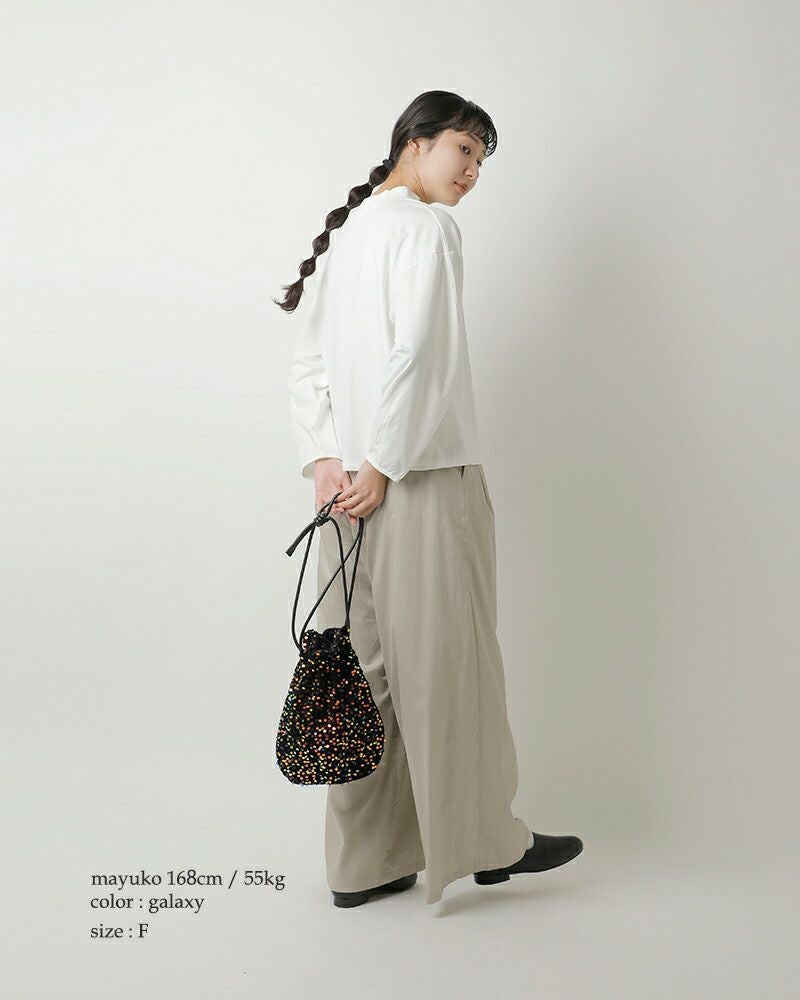 コロンとした丸みのある巾着シルエットが特徴で、可愛らしさと柔らかさを演出します。