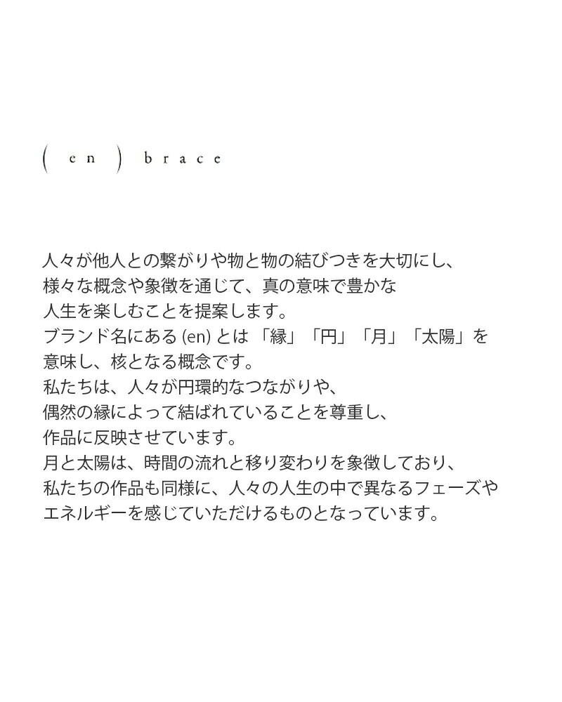 人々が他人との繋がりや物と物の結びつきを大切にし、 様々な概念や象徴を通じて、真の意味で豊かな 人生を楽しむことを提案します。 ブランド名にある (en) とは 「縁」「円」「月」「太陽」を 意味し、核となる概念です。 私たちは、人々が円環的なつながりや、 偶然の縁によって結ばれていることを尊重し、 作品に反映させています。 月と太陽は、時間の流れと移り変わりを象徴しており、 私たちの作品も同様に、人々の人生の中で異なるフェーズや エネルギーを感じていただけるものとなっています。