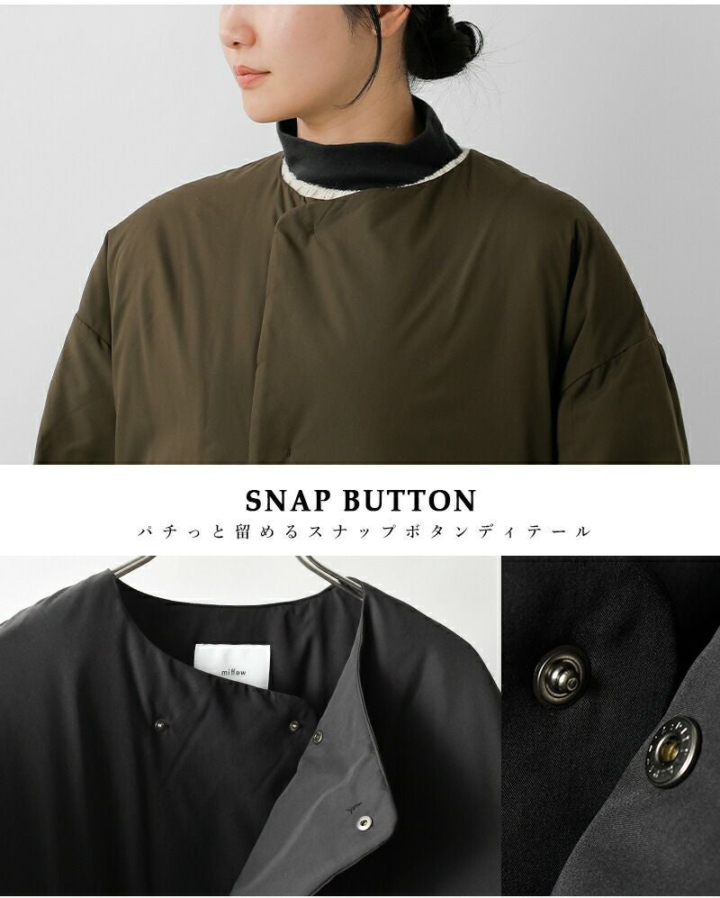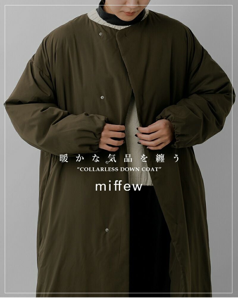 miffew(ミフュー)より、撥水 帯電防止 カラーレス ダウン コート “COLLARLESS DOWN COAT”のご紹介です。カラーレスで小ぶりな隠しドットボタン仕様のフロント。襟元は冷たい風が入り込むのを防ぐダブル仕様ですが、足捌きがしやすいように裾に向かってシングルになるデザインです。裾の両脇にあるファスナースリットを開閉することで、着こなしのアレンジを楽しめます。表面には微起毛加工を施しているため肌触りは優しく、撥水、帯電防止機能も備えています。