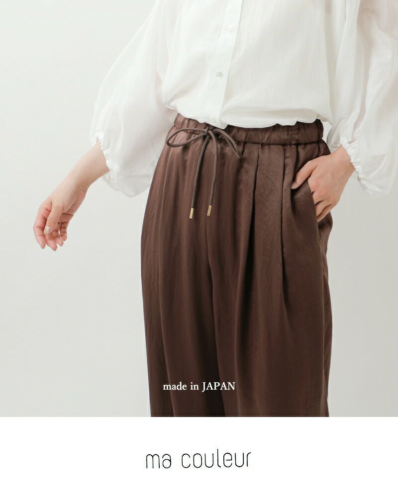 ma couleur(マ クルール)より、レザー ライク サテン ビンテージ ドロスト タック パンツが届きました。きれいめに穿けるイージーパンツです。まるでレザーのような上質な表面感のサテンと、少しシワ感のある表情のある生地が特徴です。ワイドすぎないレッグラインであらゆるトップスと合わせやすいのも嬉しいポイントです。カジュアルからキレイ目まで幅広い着こなしをお楽しみいただけるアイテムです。シワになりにくいので、旅行先でも活躍します。